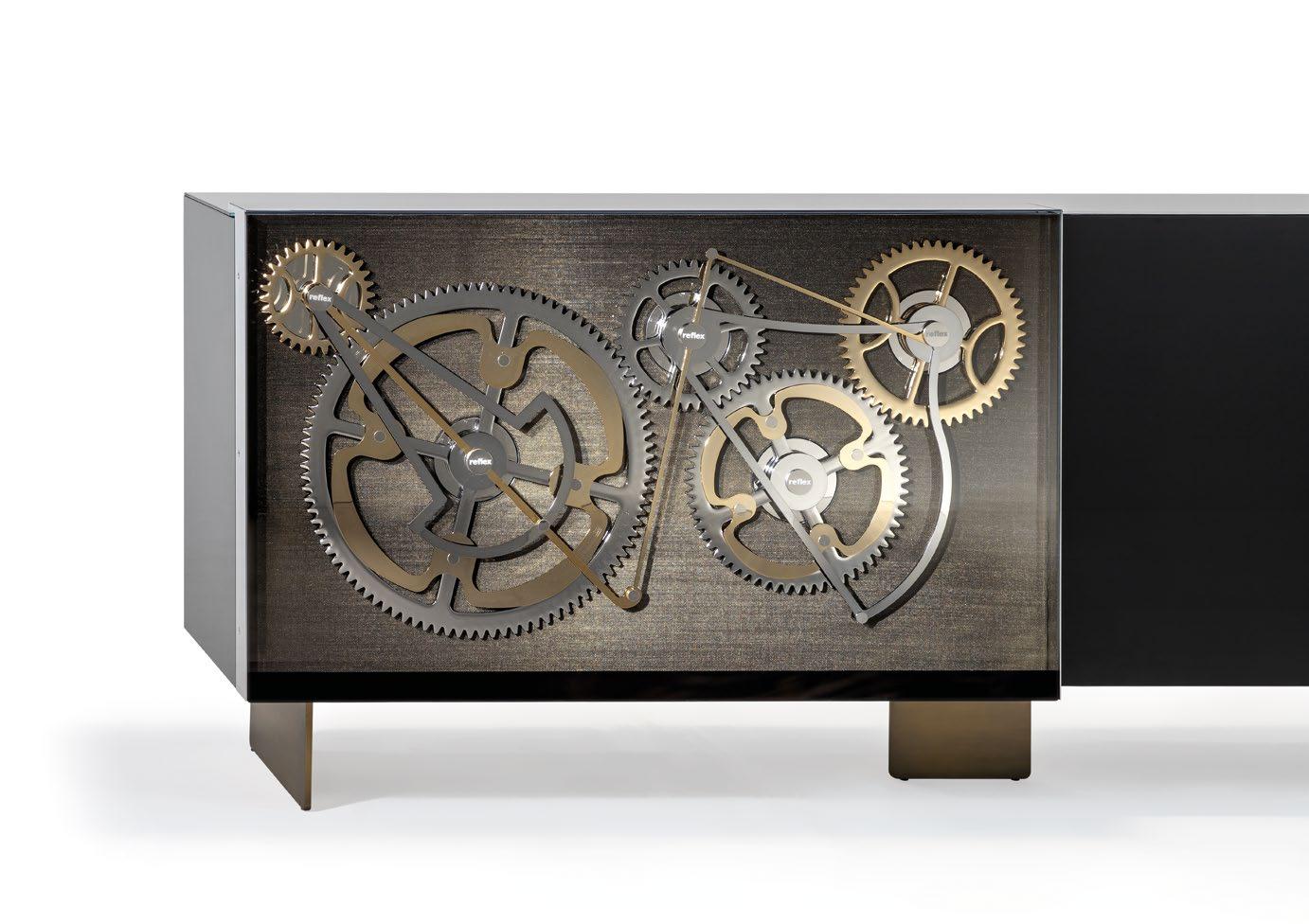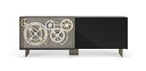 BIG BEN BUFFET Design Riccardo Lucatello External cover in Nero Beluga lacquered glass 1 door in Mesh glass with metal gears in mixed Gold and shiny Chrome finishing Custom 220 x 50 x 84 h UFFICIO OFFICE CONSOLLE CONSOLES