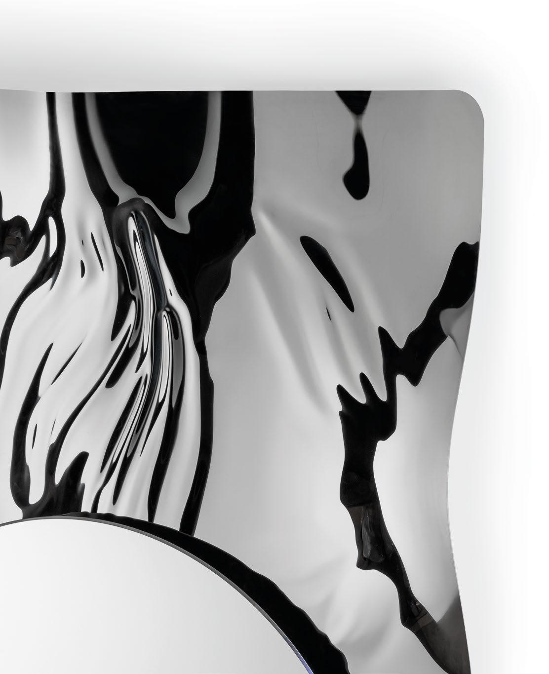 cover in Nero Beluga lacquered glass Metal legs in satin Brass finish 1 door in Mesh glass with metal gears in mixed Gold and shiny Chrome finishing 220 x 50 x 84 h
