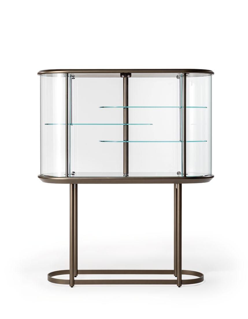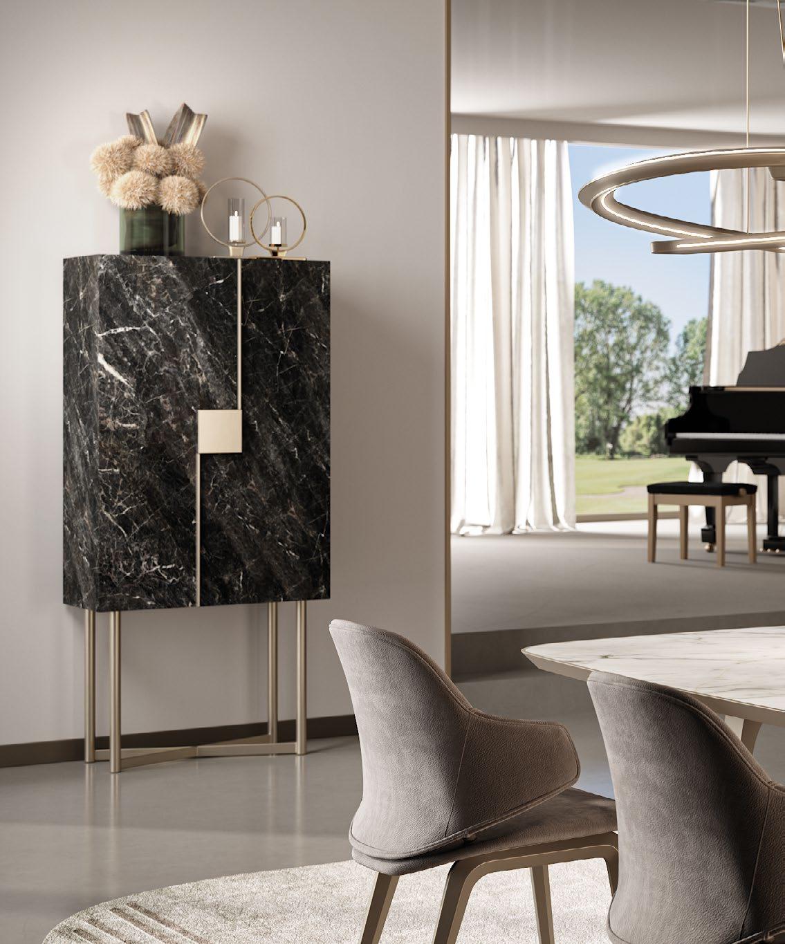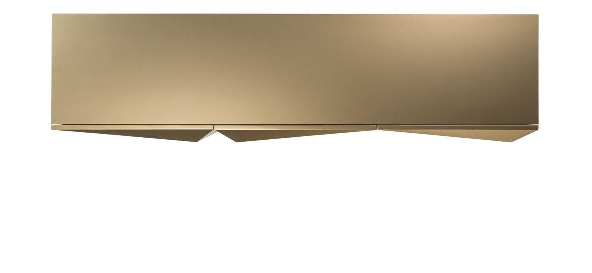 COCO DE MER BUFFET Design ∙ Riccardo Lucatello Shaped sideboard lacquered in satin Dark Brass finish Top in MarmoReflex Calacatta Oro 181 x 58 x 86 / 145 h Internal storage unit detail equipped with glass shelves UFFICIO OFFICE CONSOLLE CONSOLES