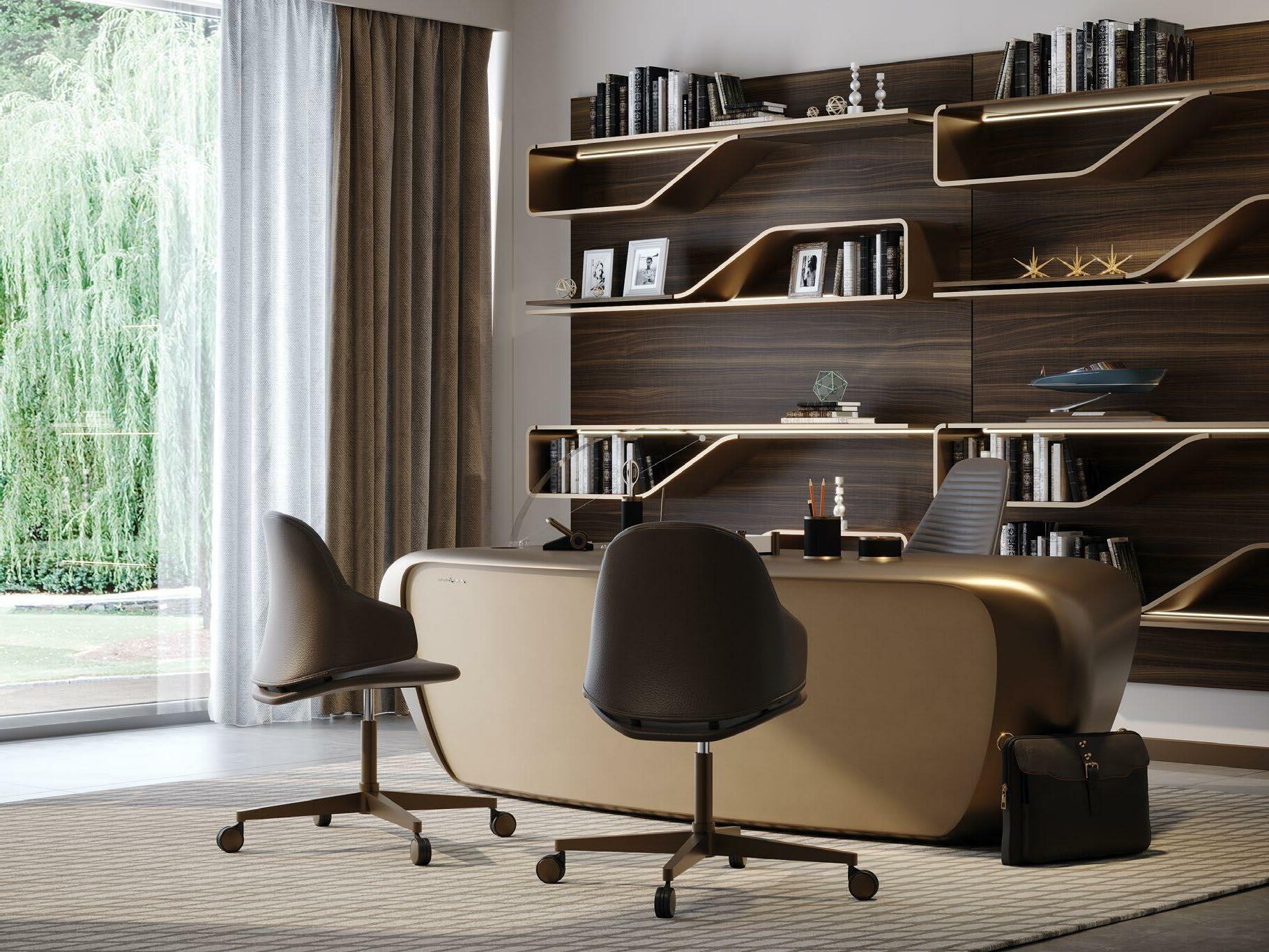 LUDWIG CHAIR OFFICE Design Riccardo Lucatello Padded seat and back in leather Nabuk Sabbia Exterior back in leather Colorata Cognac Base in satin Brass finish with pump to adjust the height and wheels 81 x 81x 95 h Padded seat and back in leather Nabuk Tortora Raised fixed base with 4 spokes in Bronze finish 66 x 68 x 92 h UFFICIO OFFICE CONSOLLE CONSOLES