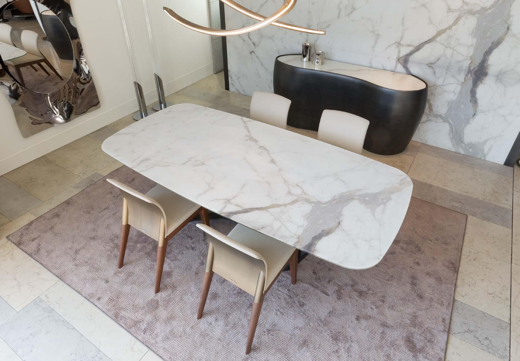 TAVOLO SEGNO 72 Square-round 250 vetro Marmo / Square-round 250 Marble glass Piano in vetro Marmo Calacatta Oro acidato sp. 15 mm filo Wing Base in materiale composito rinforzato in metallo in finitura satinata Ottone Dark 105MTop in etched Marble glass Calacatta Oro 15 mm th. with Wing edge Base in composite material with metal support in satin Dark Brass 105M finish 1 2In foto / On image: 75 250 120 DININGDINING