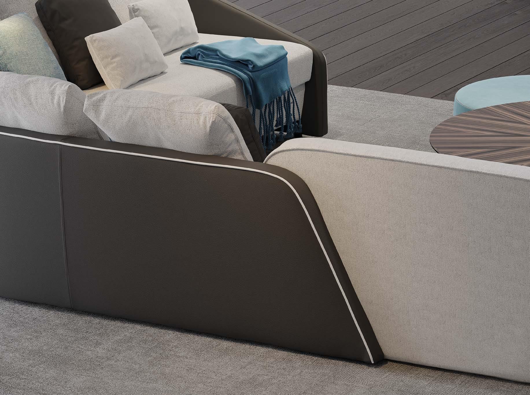 Layer 2 with back in leather Nabuk Grigio with piping in fabric Extra Amsterdam 01 and seat in fabric Luxury Milano 20 N1 sx + B2 sx 346 x 190 x 68 h