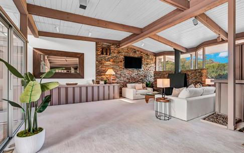 Sharp mid-century modern vibe & completely redone inside and out. Gorgeous kitchen features waterfall quartz counters, tons of cabinets with glass-front uppers, SS appl incl a gas range & wine fridge. Living area has a fabulous fireplace, walls of windows and rich wood floors. 2 sep yards with huge wrap around patios & sparkling pool. 2 car attached garage + detached insulated garage with 10’ door. Plenty of room for all your toys and no HOA!