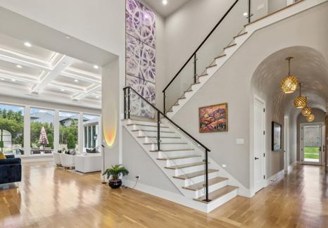 New expansive windows offer panoramic views of the landscaped surroundings inviting the outdoors in creating a sense of tranquility. The primary suite is upstairs, includes a bonus room, and has a balcony overlooking an impeccable pond. The primary bath features outstanding detail, dual sinks, custom cabinets and closet, steam shower, soaking bath and much more.