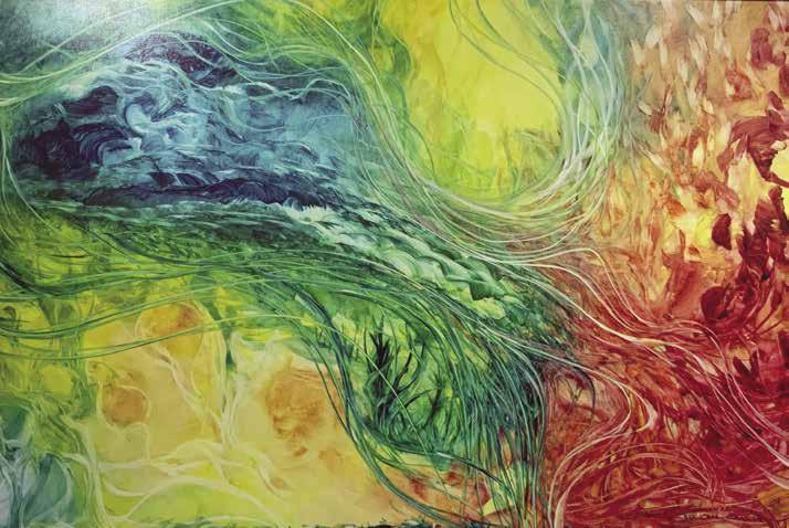 Abstract Romanticism is perhaps the most apt designation for the artist’s layered, billowing striations of dazzling color that often evoke shimmering fields of sunset and sunrise effects, the blending of Heaven and Earth, or the living sea washing over us. His work rejuvenates and elevates the mind to that state of creative union in which the ego ceases to dictate, and consciousness merges with the universe of the Beloved. Khavarani resurrects the romantic possibility that art can change the world by reaching out unstintingly to the heart and imagination of the individual spectator.