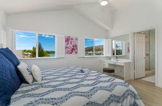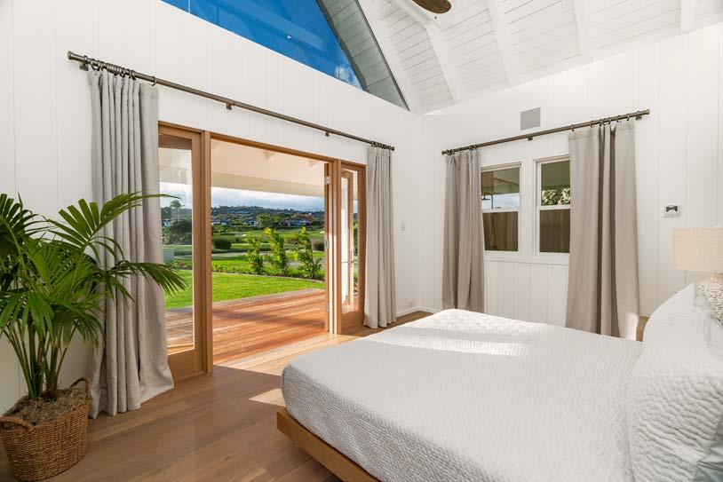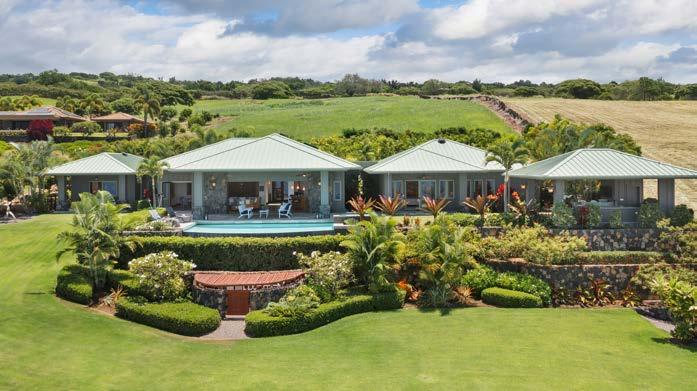 Caesarstone countertops add sophistication. e kitchen features top-of-the-line appliances, and the bathrooms boast high-end fixtures. Outside, a private pool, spa, and guest house offer relaxation. is masterpiece is in Kaulu, between e Shops at Kukui‘ula and the Clubhouse, with golf course views.