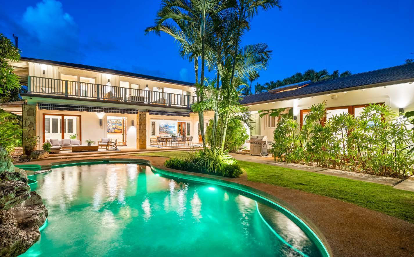 Island Retreat! Situated on a wonderful street in Kahala, one of Honolulu’s most coveted neighborhoods, rests this fabulous 3-Bedroom + separate Den/exercise room, 3-full & 1-half bath residence. From the moment of arrival, one is enveloped by a sense of utmost privacy amidst lush tropical landscape, fruit & flowering trees, and a tropical water feature cascading into a free form pool & spa. is lovely home with Eucalyptus hardwood floors & custom glass Mahogany doors, pocket revealing wide open living spaces & a seamless integration between indoor/outdoor island living. Ideally located only a few blocks to the beach, e Kahala Hotel, dining/shopping & more!