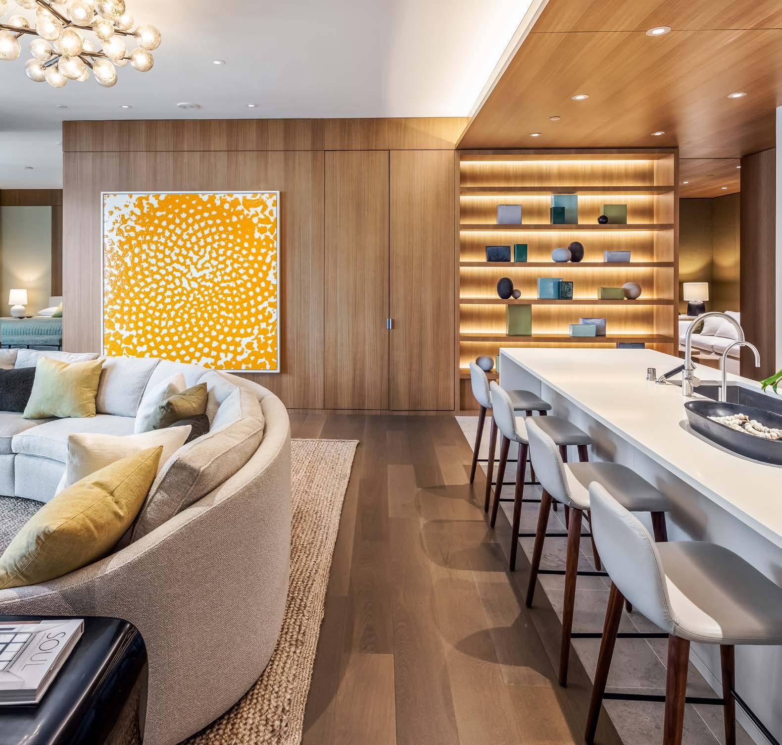 is 2-Bedroom+Den residence is reminiscent of an Aman hotel-inspired aesthetic, featuring interior design by acclaimed San Francisco designer David Oldroyd of ODADA, one of the lead designers for the Park Lane common areas. Every detail was curated to match its owner’s taste. Built to reflect classical palettes with a modern twist, the interior has been meticulously crafted to create effortless perfection. Upgrades include Big Island Eucalyptus wood paneling, German limestone entry, luxury upholstery on the bedroom walls + window coverings, new luxury lighting, custom closets, new drywall, extra tall doorways & all new designer furnishings.