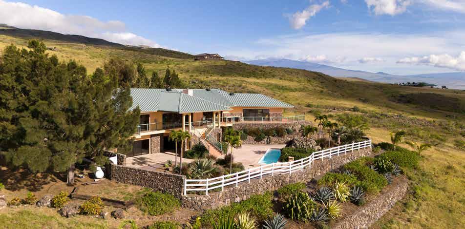 Two combined lots spanning 25 acres, this private estate offers unparalleled panoramic ocean, coastline, and mountain views. Designed to embrace the natural beauty of the Big Island, this luxurious home blends elegance, sustainability, and island living at its fi nest. Featuring rich hardwood and tile flooring, gas fi replace, gourmet chef’s kitchen with formal dining and living space, primary and secondary suite plus 2 spacious bedrooms complement the main floor. Expansive lower level boasts a 6-seat movie theater with 155’ screen, guest bedroom, workout and entertaining space, 40’ ft lap pool with heater, and lava rock waterfall. Solar gated entry, AG building, 30 panel NEM photo voltaic system with battery back-up system.