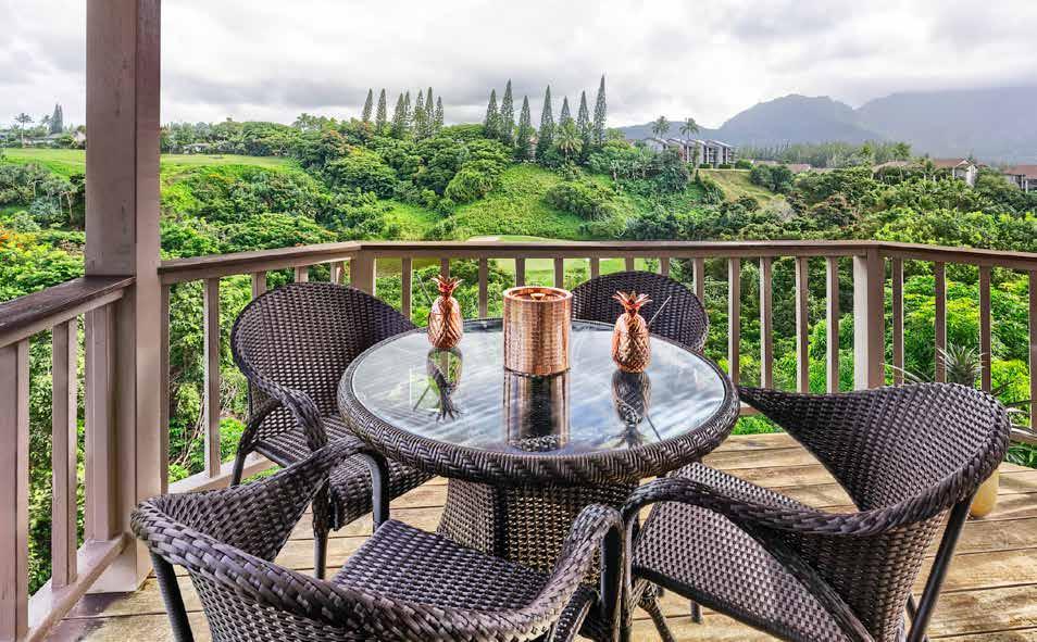 Escape to paradise in this stunning 5-bedroom, 4.5-bath vacation rental in a tranquil Princeville cul-de-sac. With breathtaking mountain views and a lush yard, this home boasts a floor plan maximizing natural light, space, and style. Two living rooms—one on each level—offer extra comfort. Exposed beams add elegance to the spacious interiors. e gourmet kitchen features granite countertops, stainless steel appliances, and a large dining area. e wrap-around lanai is perfect for BBQs and mountain views. Near the 1 Hotel, golf courses, and Hanalei, this home is ideal for families or as a vacation rental.