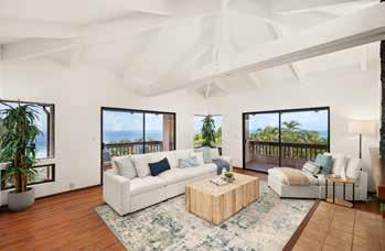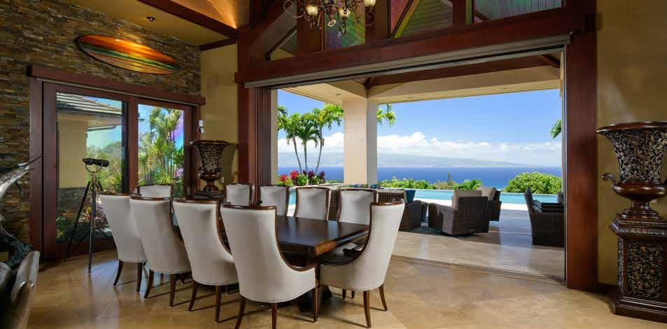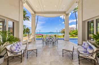 Lahaina, Maui | 8,412 SQFT .51 AC | 7BR/8.5BA MLS# 406991 | $19,750,000 is magnificent oceanfront West Maui estate rests on approximately 1/2 acre of prime land in Kahana with over 250 feet of ocean frontage. Located between Kaanapali and Kapalua Resorts, this residence epitomizes Pacific Rim architecture. Glass pocket doors slide into rock walls bordering the spacious great room, which includes grand living & dining area, open kitchen, and enclosed butler’s pantry. A floating mezzanine soars above the great room with a sports bar and game tables. ere are 7 oceanfront suites, each with a luxurious bath, most with a wet bar, plus views of Lanai and Molokai. e large primary suite offers complete privacy, custom Jacuzzi tub, built-in wall speakers, and expansive closet. Attached oceanfront 1-bedroom Ohana for office, caretaker, or guests. Offered turnkey.