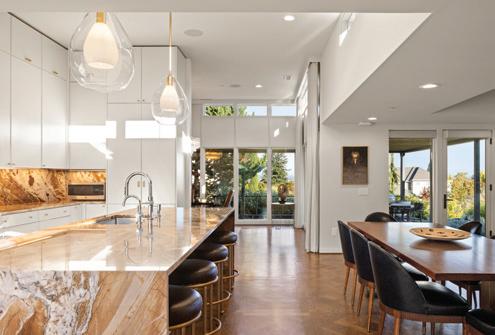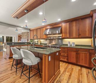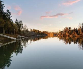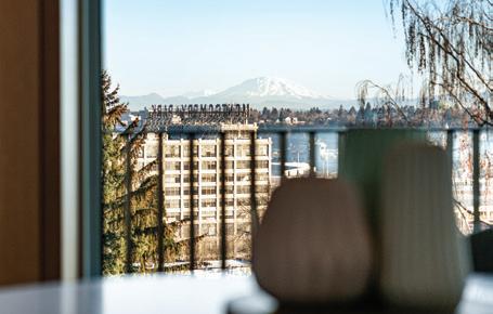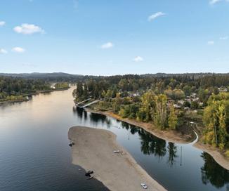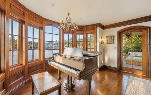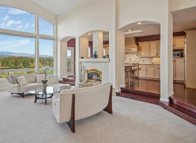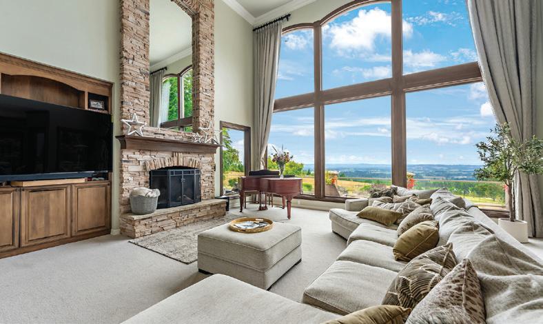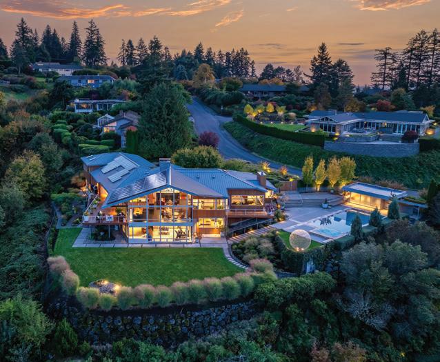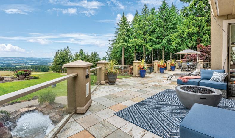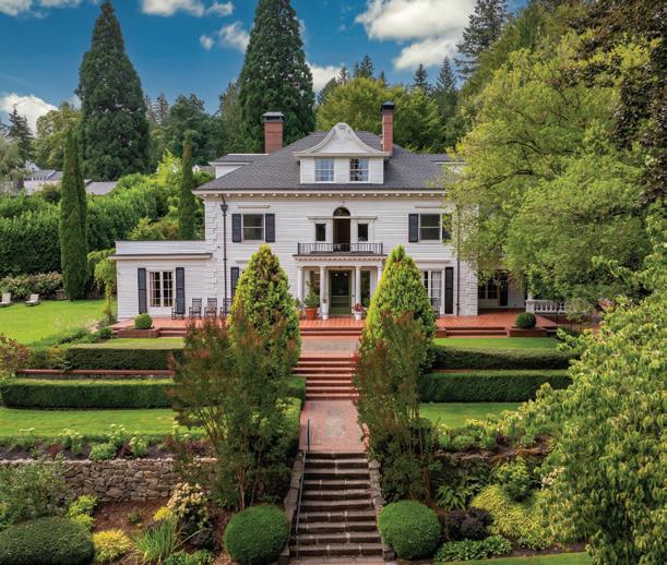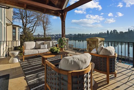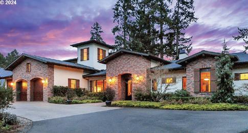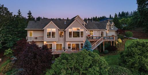 Nearly every room in this exquisite Europeaninspired estate captures stunning, unobstructed views of the Willamette River, creating a serene and picturesque backdrop for everyday living.