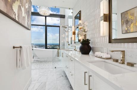 • Elevator, showcase kitchen, full bar, all new audio and AV throughout, media room with 140 inch screen, complete gym, guest suite, game area, pool bath with steam and sauna, lap pool overlooking the city and three vehicle garage.
