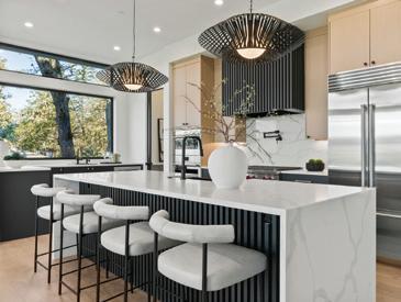 Clean lines, floor-to-ceiling windows, and seamless indoor-outdoor flow define this three-level retreat. The great room stuns with bold black finishes, a natural stone fireplace, and a sweeping balcony. A gourmet kitchen with a waterfall-edge island and top-tier appliances opens to sunlit spaces.