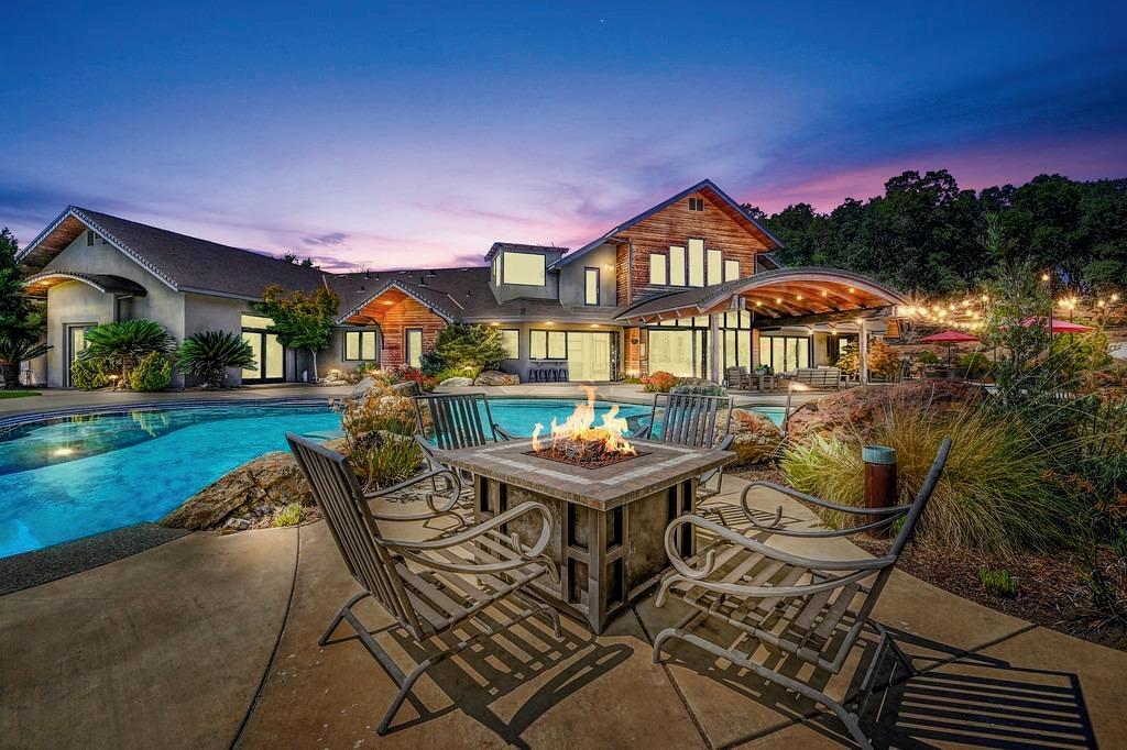 Stunning sunsets and breathtaking views await! Nestled in the prestigious, gated Emerald Peak community of El Dorado Hills, this exceptional Lennar built home offers luxury living with an outdoor space designed to impress. The spacious great room with a gas fireplace opens to a beautifully designed backyard with multiple patios, striking fire bowl features to accent your evenings outside.