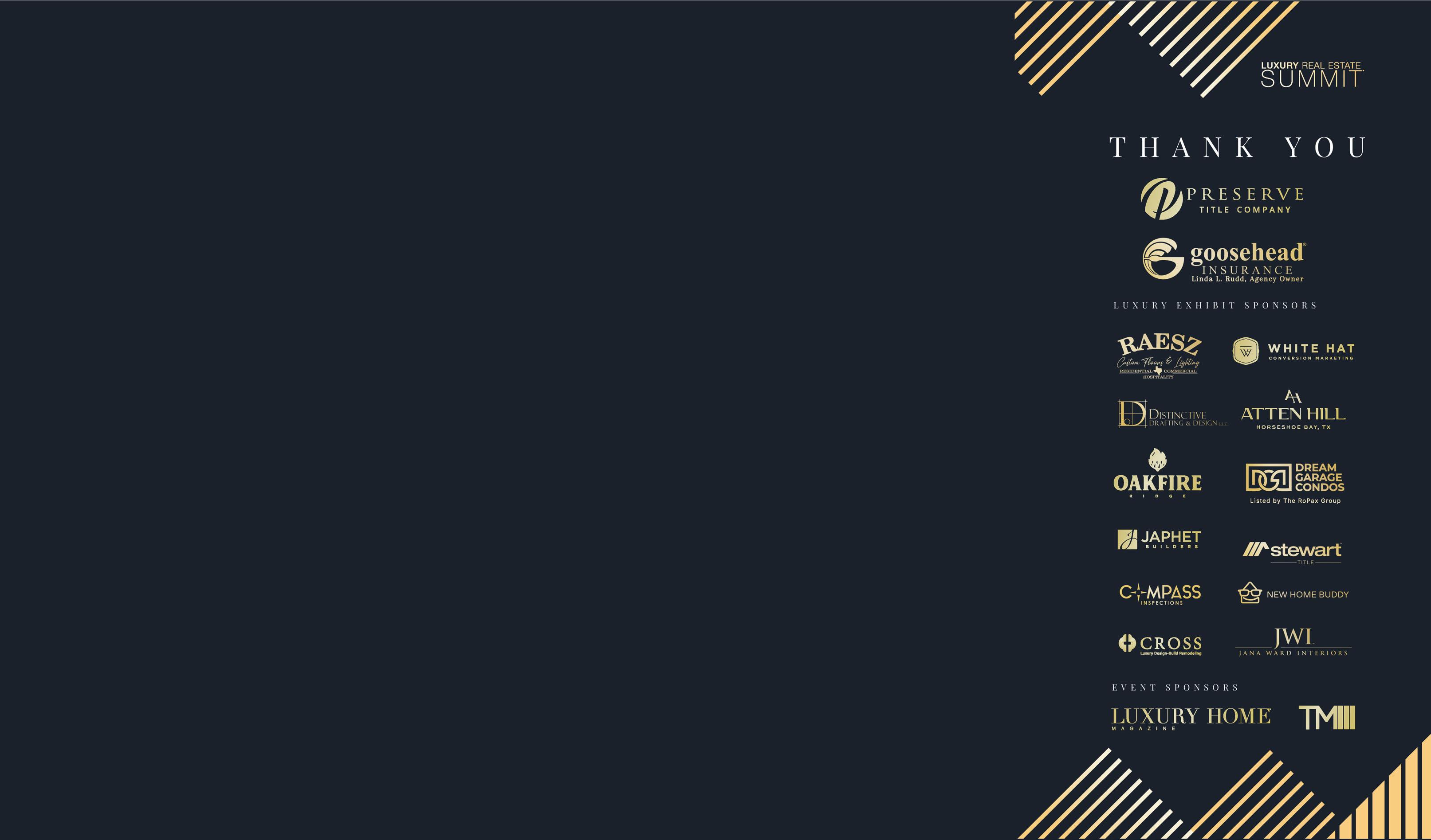 We extend our deepest gratitude to our exceptional Sponsors, Exhibitors, Speakers, and the entire JW Marriott San Antonio Team for making the Luxury Real Estate Summit an unparalleled success. After a decade, the Summit returned to San Antonio stronger than ever, welcoming over 500 industry professionals for a day of transformation and connection. We are honored to have shared this exceptional gathering with the real estate community.