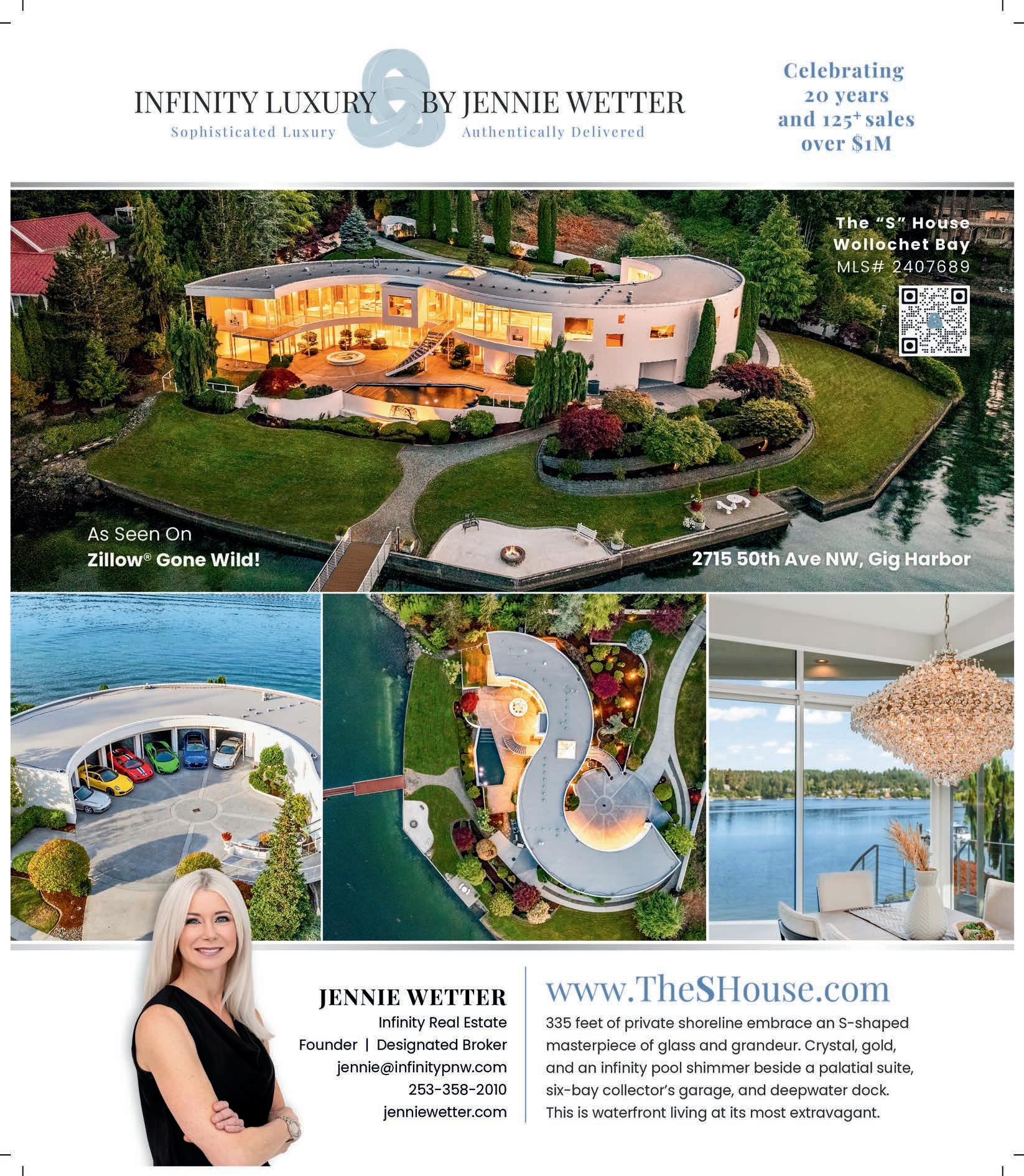 In 1993, Evans and her husband moved to Bainbridge Island to raise their four children—two sets of twins—in what she hoped would be the perfect community. “When I arrived, there were just 14,000 people here. Today, it’s more than 25,000. It has grown into what Vogue has called the ‘Nantucket of the Northwest.’” Evans has embraced that growth while maintaining the island’s unique sense of character. For the past 15 years, she has been Bainbridge’s numberone agent, selling more waterfront properties than any of the island’s 200-plus agents. Remarkably, about 90 percent of her business comes through referrals. “Customer service is a dying art,” she says. “For me, it’s the cornerstone of every client relationship.”