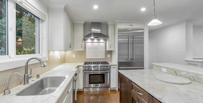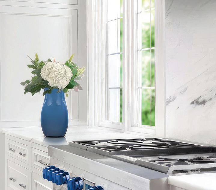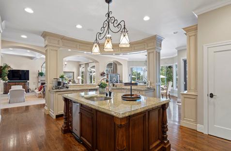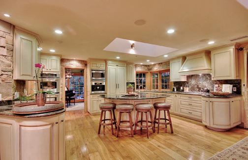 Chef’s kitchen, with state-of-the-art appliances and island, opens to the family room offering a cathedral ceiling and French doors to the terrace