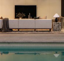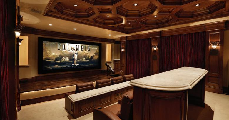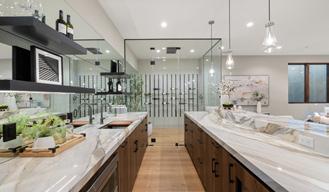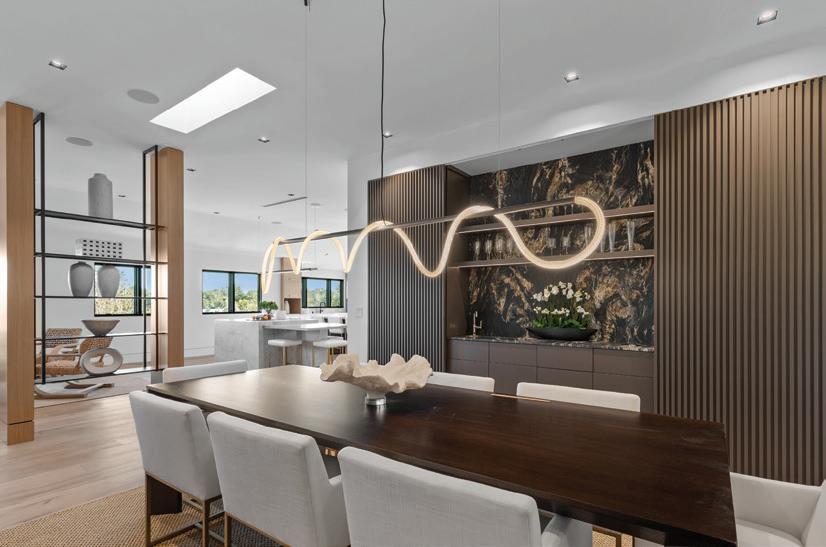 Designed for both everyday living and entertaining, the main kitchen impresses with natural stone surfaces, vertical grain white oak, and walnut cabinetry, and high-end appliances. Other exceptional features include a glass-walled wine cellar, a Dolby Atmos-wired theater, an entertainment room with a wet bar, and expansive outdoor spaces complete with a kitchen, fireplace, and media area with fire pit.