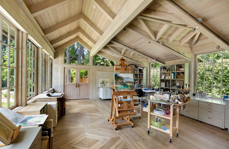 Interior spaces are distinguished by soaring ceilings and expansive windows, complemented by natural finishes that include European white oak floors, aromatic western red cedar-paneled ceilings, and solid wood interior doors.