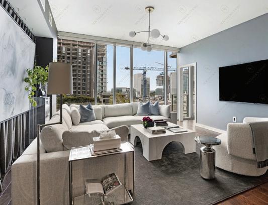 Coveted unit in Twelve Twelve with a third bedroom flex space. Sandra Britt Interiors creates a beautifully updated space for current tenants with a serene Living area, cozy den/office, and bright, airy primary and second bedrooms. Move in before Spring!