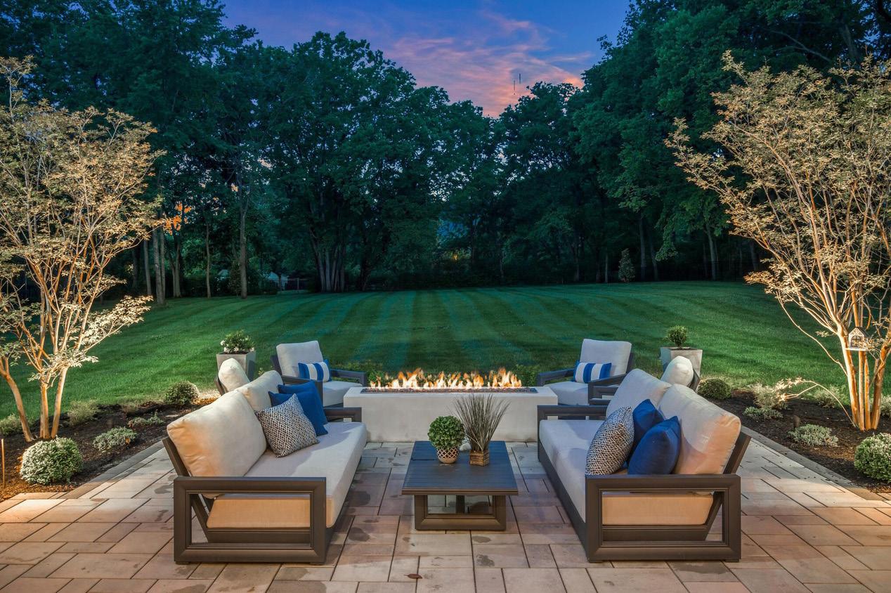 Once Outside, the meticulously manicured outdoor spaces provide the perfect setting for relaxation a nd entertainment. An overabundant terrace that features an infinity edge jacuzzi , architectural sty le speakers, and a gas fire pit, also known as the “fire wall.”