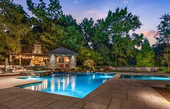 Gunite, heated salt water pool w/ 2 hot tubs, waterfall, sundeck, outdoor