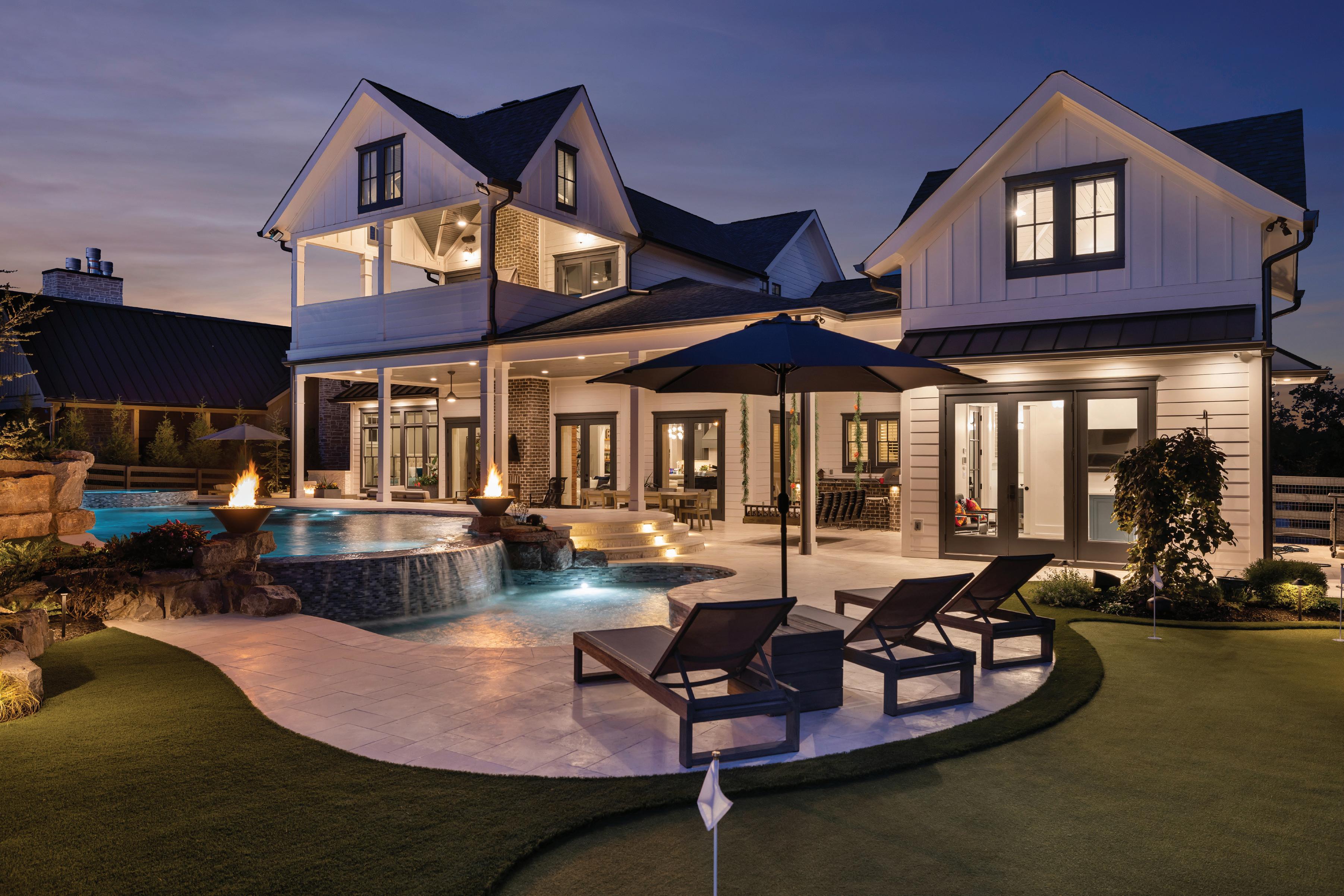 Enter through Iron Lion double front doors to discover a gourmet kitchen, lavish primary suite, and entertainment amenities like a pool with bar seating, spa, and fire feature by Rondo Pools. Crafted by Preston Quirk, JBT Construction, and JFY Designs, this new luxury home sits on an estate lot backing up to lush greenery.