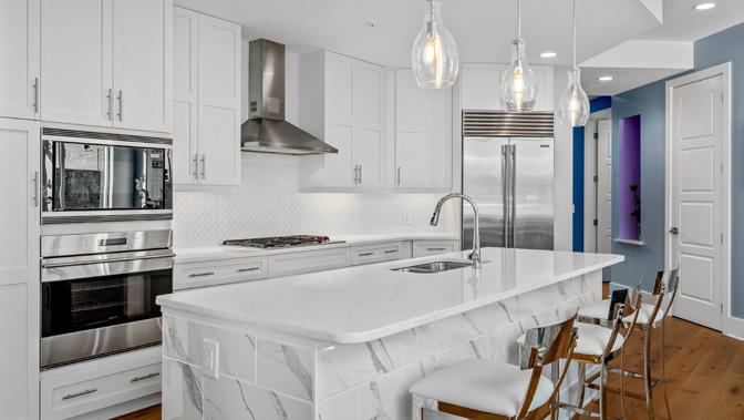 w a t e r f a l l q u a r t z c o u n t e r s e a d t h e e y e t o a s e t o f A m i s h b u i l t w h i t e o a k c a b i n e t s i n t h e o p e n e n t e r t a i n e r s