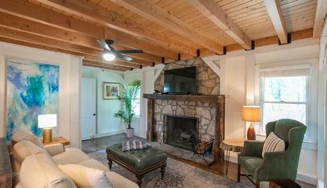 an open Living/Kitchen area with a stone fireplace, vaulted wood ceilings, spacious kitchen with ample