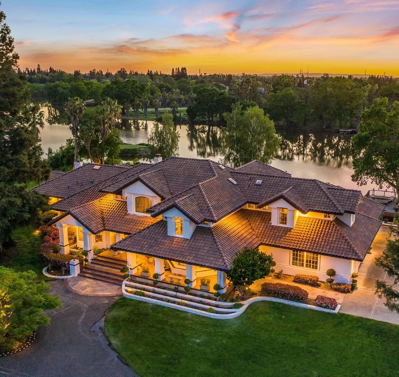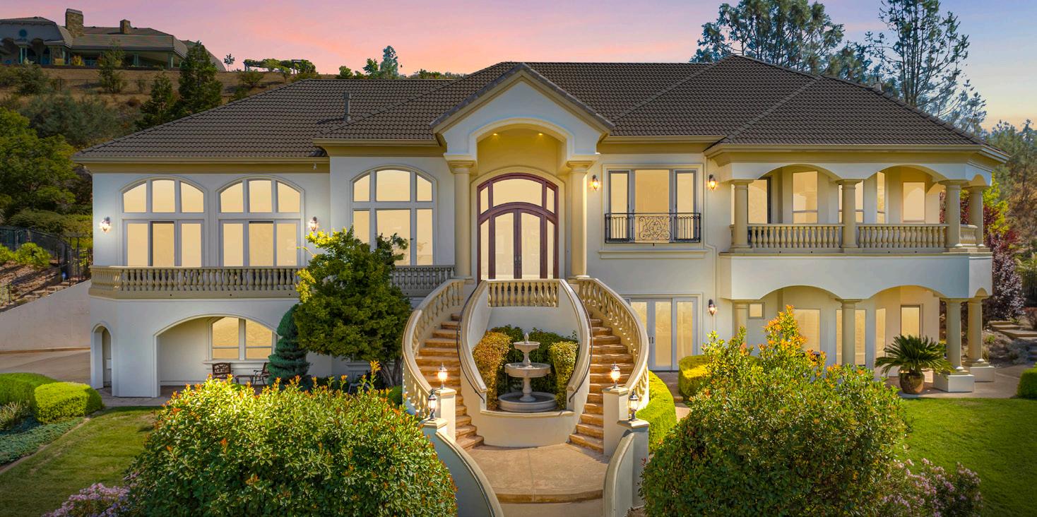 This Palatial estate sits at the very top of Los Lagos over looking Folsom lake. It has uninterrupted views of the Sierra Nevada mountains & the Sacramento skyline. There is a 1,200 sqft commercial quality gym, a tennis and basketball court.