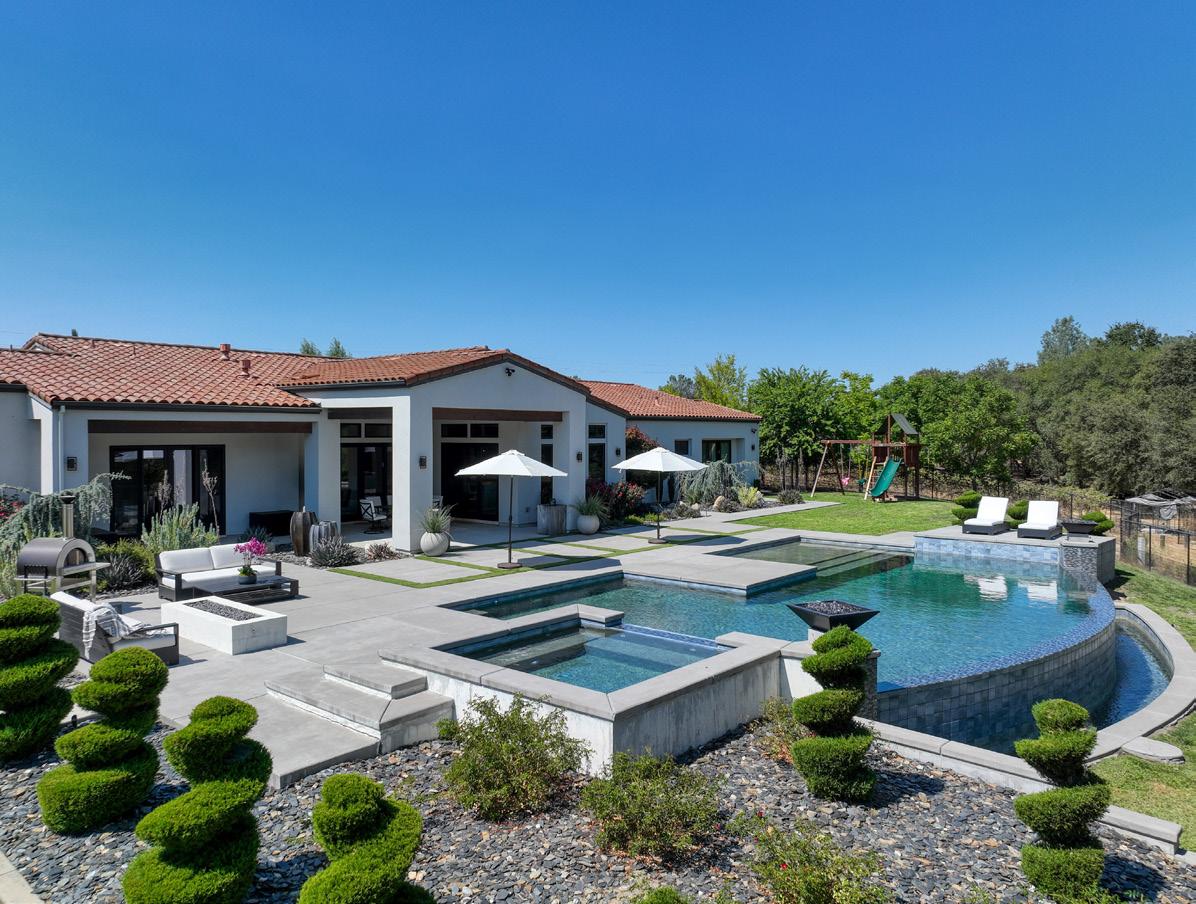 • Backyard oasis with new pool, spa, pavilion, outdoor kitchen, organic veggie garden and acres of lush green grass.