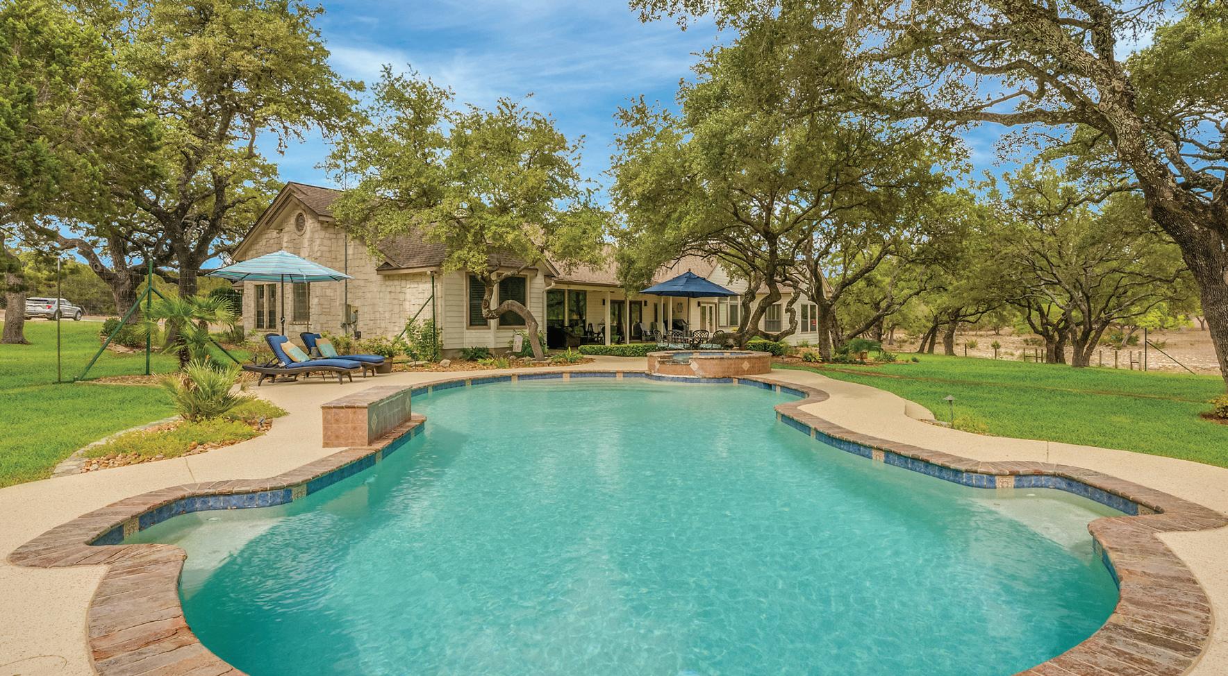 141 woodland ranch road. Classic 5 bedroom, 4 bath Hill Country stone home on 13.96 tree-studded acres. Living spaces feature soaring and beamed ceilings, numerous built-ins and recently updated kitchen. wraparound porch and spacious patios overlook the pool, spa and gazebo. Pool house/guest quarters includes a full bath. Property is gated, fenced and cross-fenced – $2,195,000