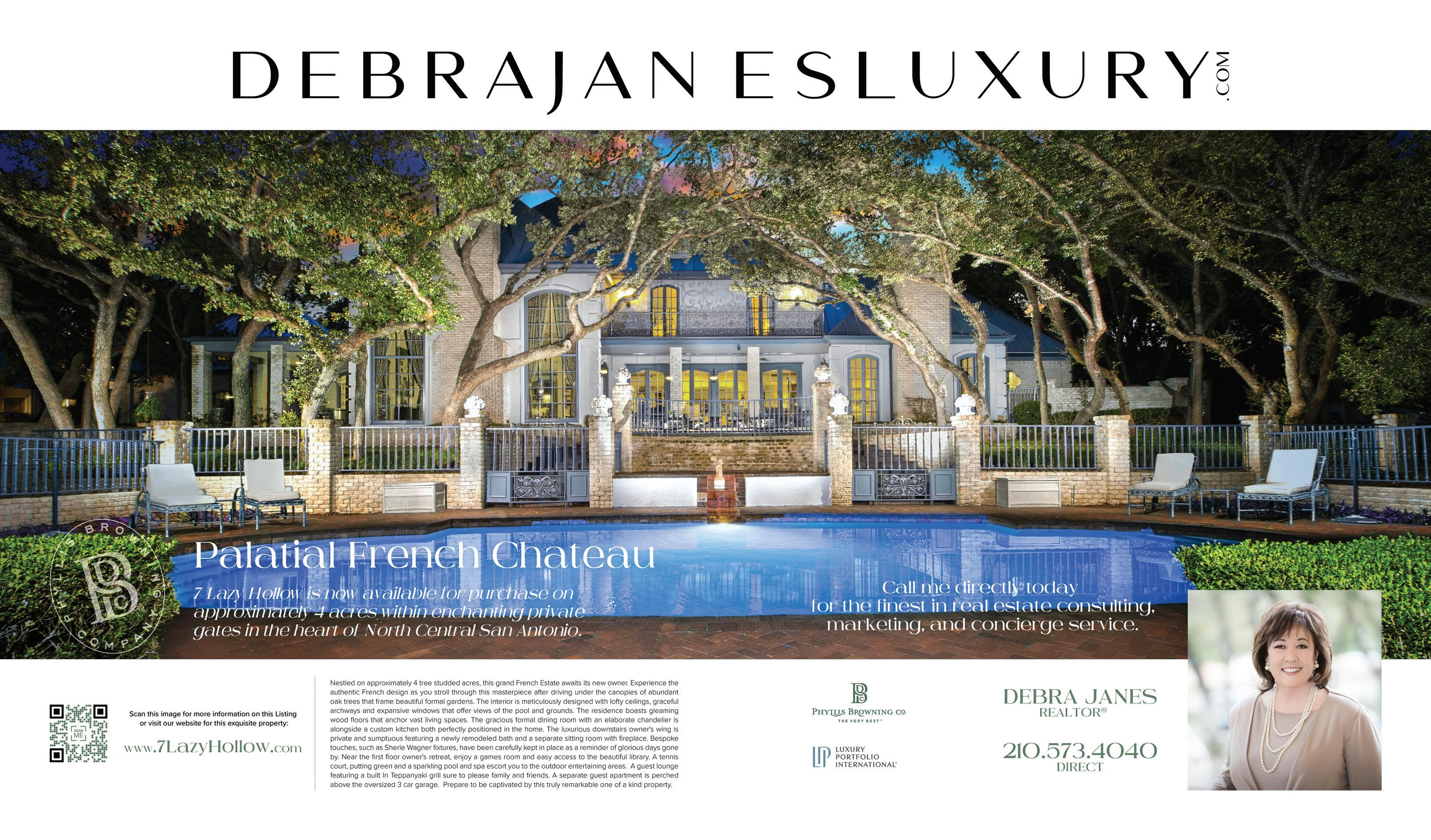 • Gameroom with built-in Bunks • Garage Apartment Available upon request 3.62± Acre 5 ½ LESLIE BROWN SRES, REALTOR® lbrown@phyllisbrowning.com MOBILE (210) 845-4484 PHYLLISBROWNING.COM AUSTIN BOERNE FREDERICKSBURG NEW BRAUNFELS SAN ANTONIO LuxuryHomeMagazine.com | 89