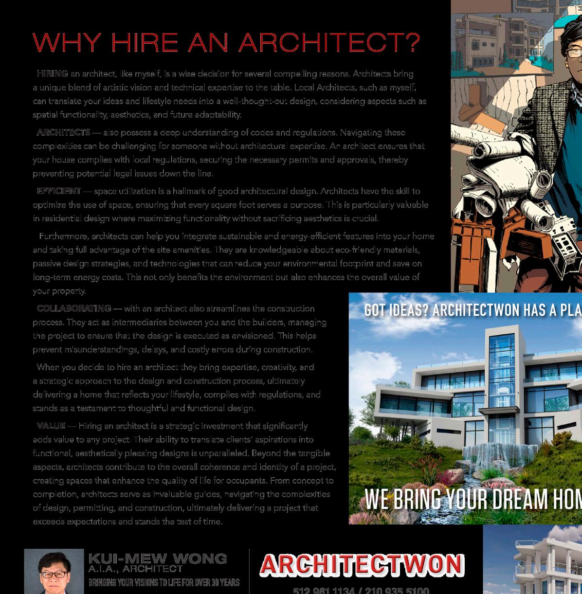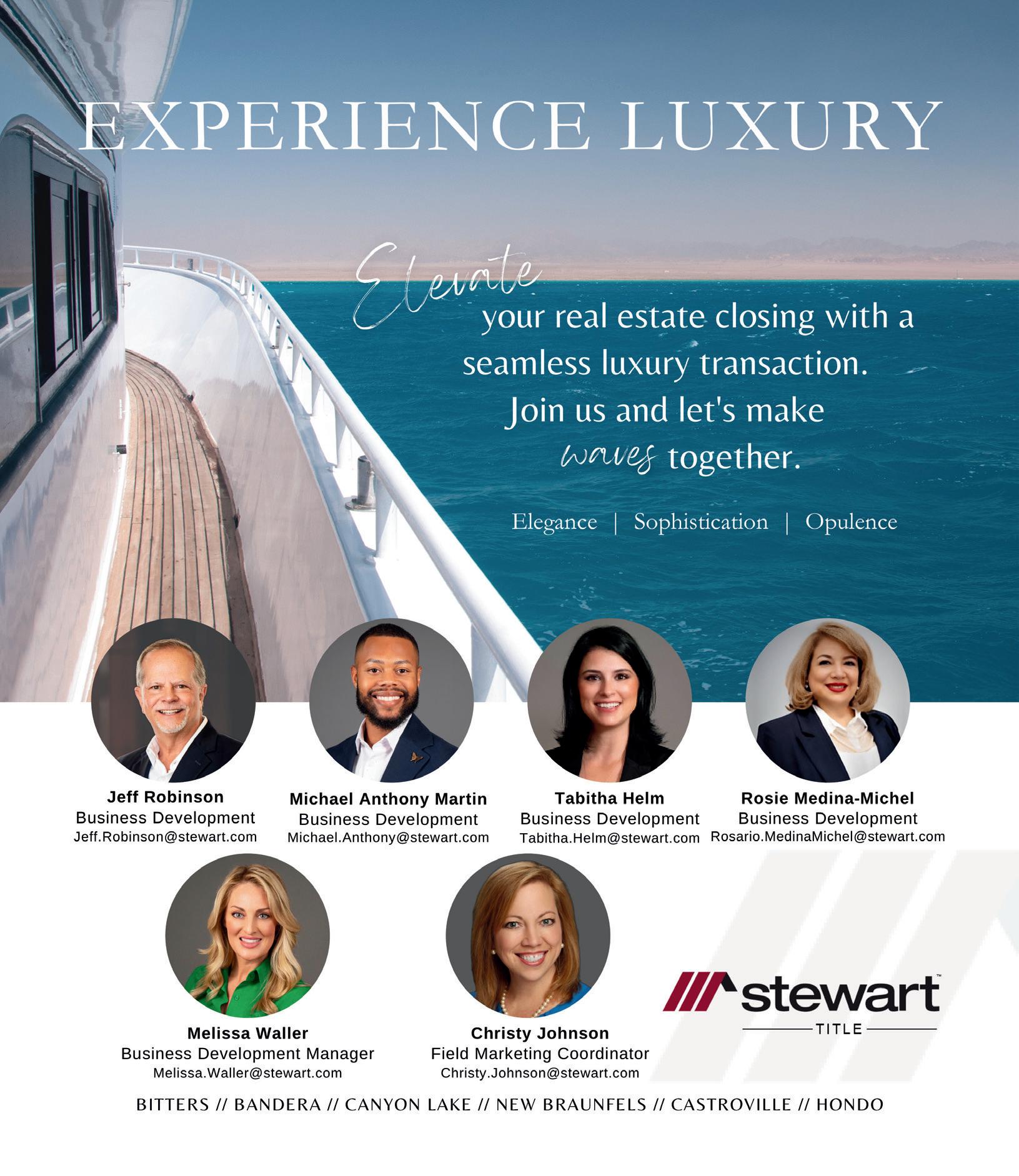 service We are here for you every step of the way l e a d e r s i n t h e u l t i m a t e l u x u r y c l o s i n g e x p e r i e n c e | C H I C A G O T I T L E S A . C O M | 2 1 0 . 4 8 2 . 3 6 0 0 S a n A n t o n i o Your Business Development Team M e g a n S a n d e r | D o n n a P o t e a t | N a t a l i e B i g g e r s | K e l l i P e a r s o n | S a r a h B l o m s t r o m | P o l l y K e e n e 14255 Blanco Rd | San Antonio, TX 78216 For advertising information: (210) 481-6464 | info@lhmsat.com LUXURY HOME MAGAZINE