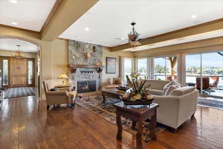 A stunning private gated community overlooking Hayden Lake with community parks, trails, pavilion, tram, sport court, and private marina o ering a boat slip for each home! Situated on the point, this is the most coveted location in The Falls at Hayden. This property o ers an expansive lawn to the historic stone wall above Hayden Lake, with lake and mountain views that will take your breath away.