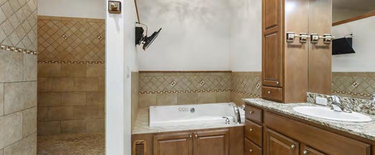 Retreat to the opulent main floor primary suite. The suite features double walk- in custom closets, jetted soaking tub, separate shower, double sinks and custom porcelain tile. relaxation and indulgence at it’s best.