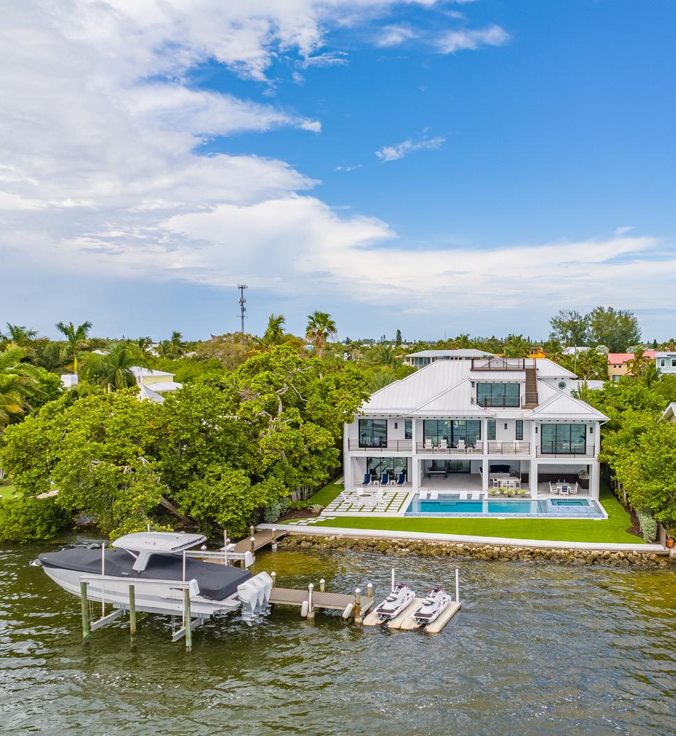 STUNNING COASTAL modern masterwork with commercial grade concrete/steel construction designed to withstand 250 mph winds! Mammoth 20ft+ high great room with towering floor-to-ceiling windows. 5579 sqft of inspiring living area. Spectacular 1920 sqft rooftop sundeck delivers incredible 360º waterviews! Beautiful pool + hydrotherapy spa. Boat lift/new dock. OFFERED FOR $4,500,000