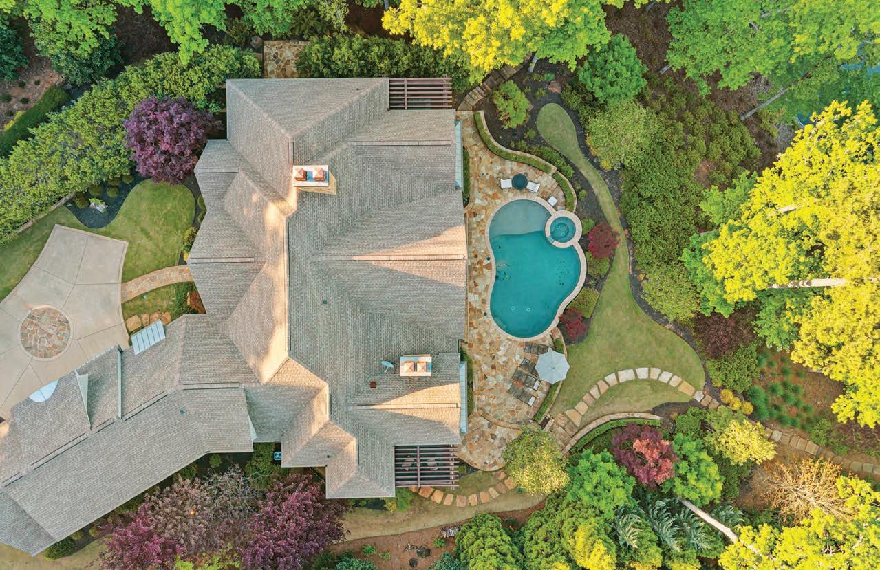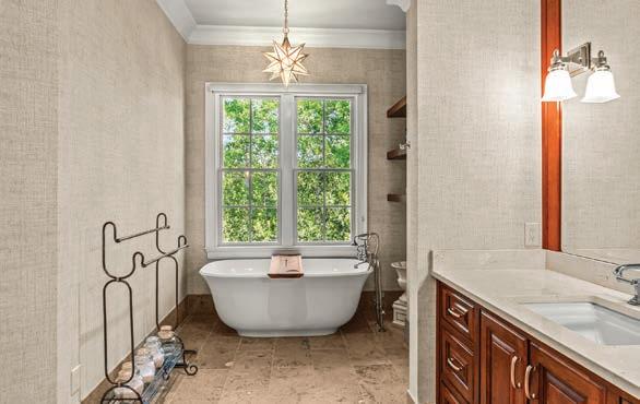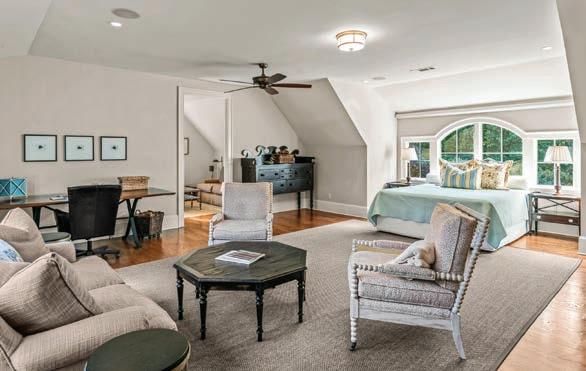 Completing the interiors, the guest suite above the garage o ers ample space with a si ing area/bedroom and full bath— perfect for extended visits or long-term stays. Additional features include a walk-in pantry, powder room, laundry room, home o ce nook, and built-in mudroom o the threecar garage. Whole-home audio, including invisible speakers throughout, enhances every space.