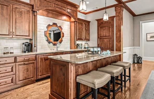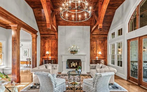 e soaring great room and dining area welcome you to the main level with a statement limestone replace and abundant natural light. French doors anchor the space to a spacious, open-air covered patio—ideal for entertaining—with a second replace and an outdoor dining area overlooking the pool and stunning lake views. e chef’s kitchen boasts 12-foot co ered ceilings, granite countertops, custom cabinetry, and top-tier appliances by Sub-Zero, Wolf, and Miele. A keeping room with a stone replace, a breakfast nook, and a lakeside screened patio invite relaxed living.