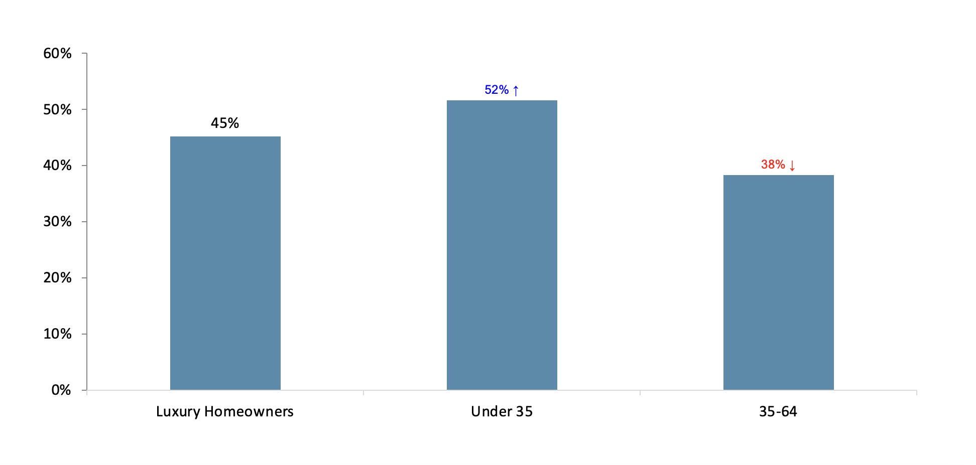 Ninety-one percent of luxury homeowners across age groups are considering making additional investments in real estate, but younger homeowners are more likely to reduce their overall investment in real estate for diversification.