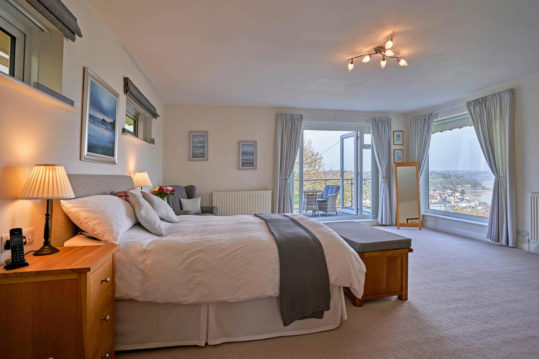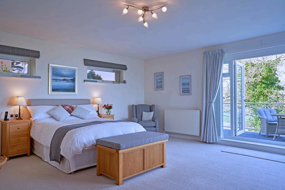 The Principal Bedroom Suite occupies its own tranquil wing on the first floor, positioned so the sea is the very first thing you see each day. This dual-aspect retreat features a private balcony and a dressing room. The ensuite is equally impressive, offering electric underfloor heating and a freestanding soaking tub designed for total relaxation.