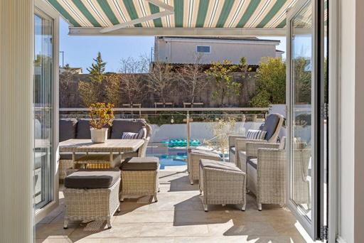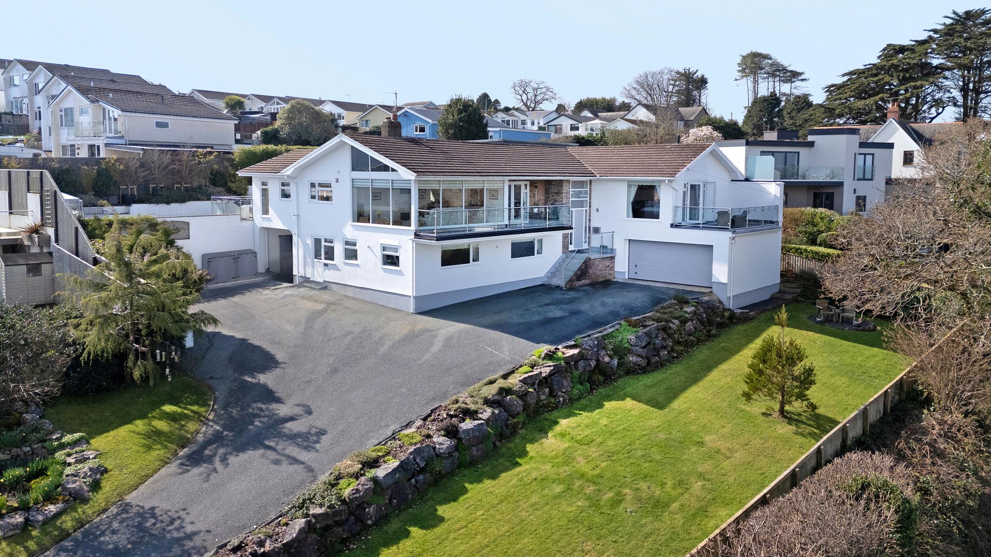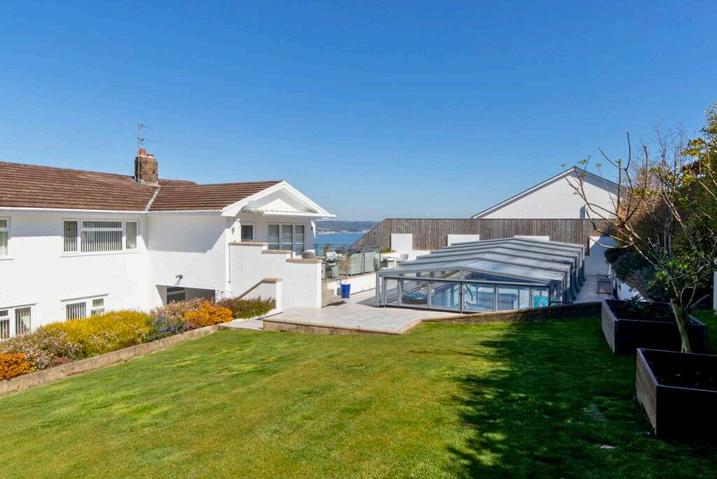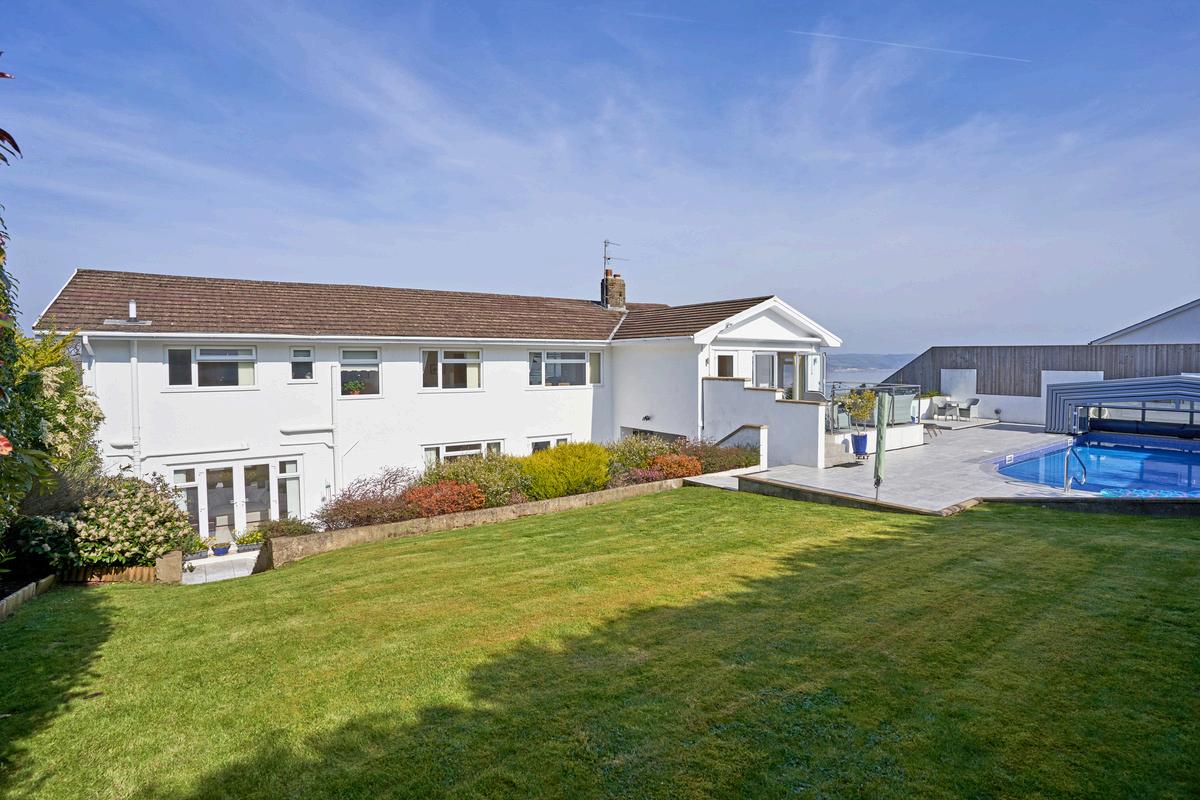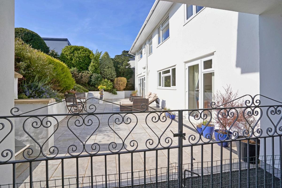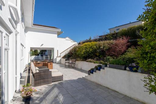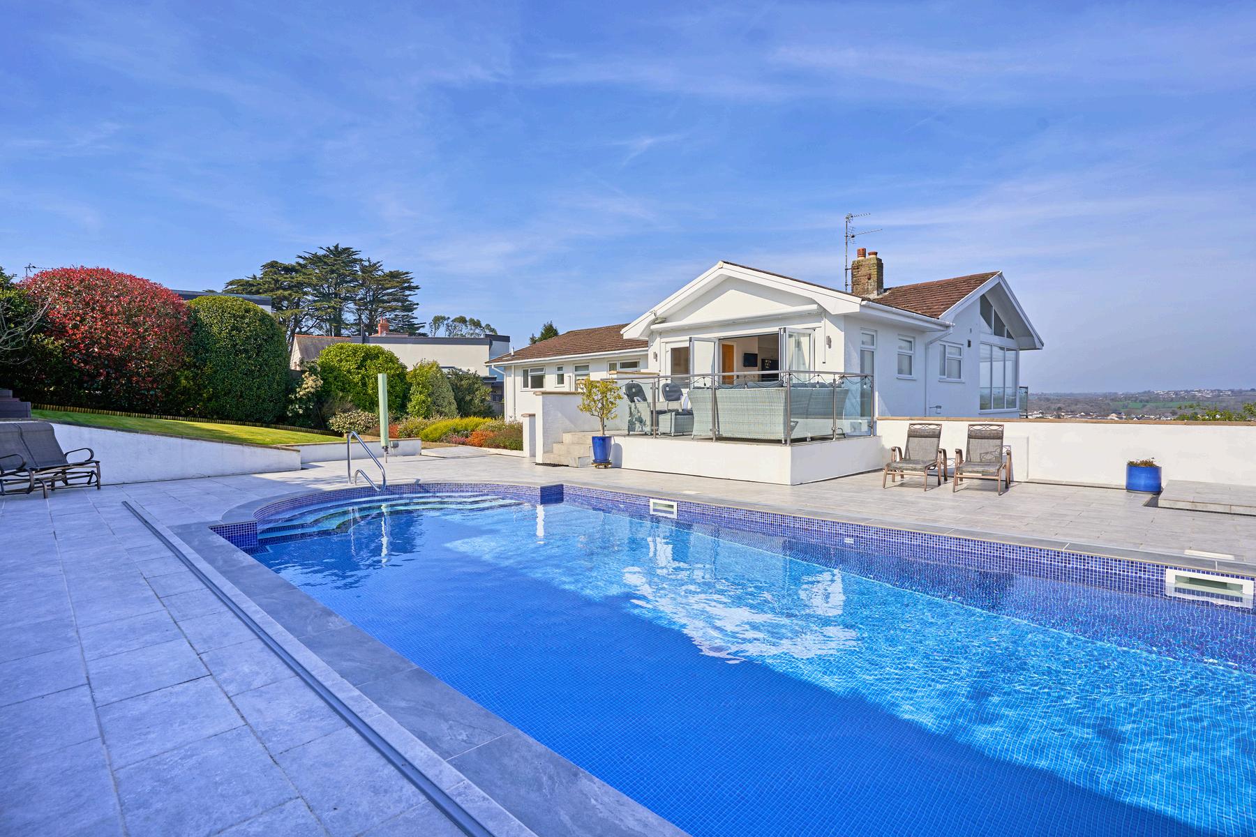 The grounds of Bevelin House are a masterclass in privacy and leisure. The lawn and sun-drenched terraces lead to the true star of the exterior: a heated outdoor swimming pool. The pool features a lockable, fully retractable, cover and a dedicated, easily accessible plant room neatly tucked beneath the terrace. Whether you are enjoying a sunset drink on the balcony or a morning dip in total seclusion, the home offers a rare sense of peace, all while being just a gentle stroll from the vibrant village and the golden sands of the beach.
