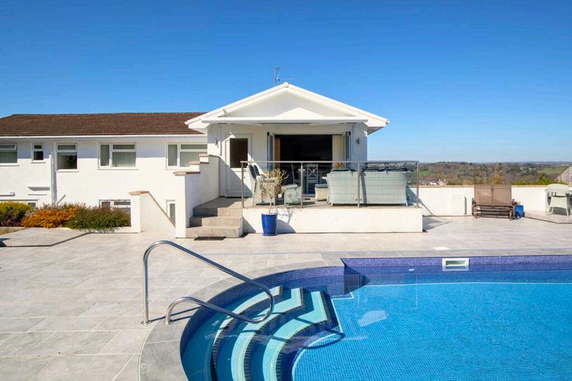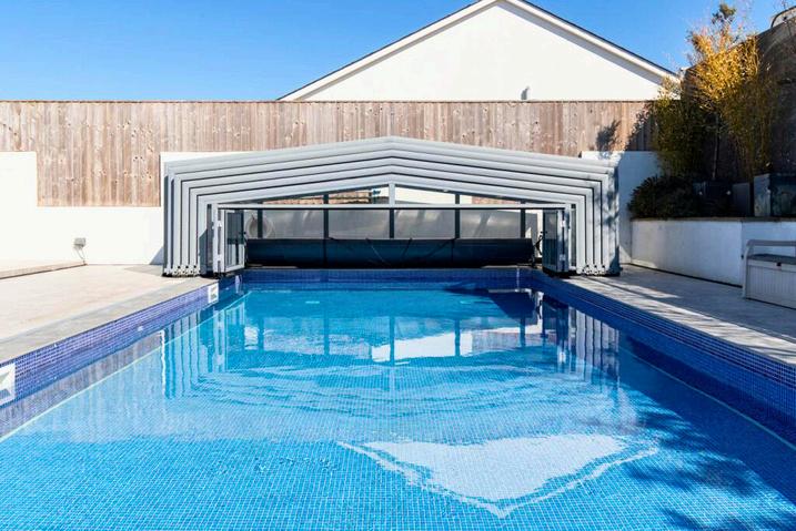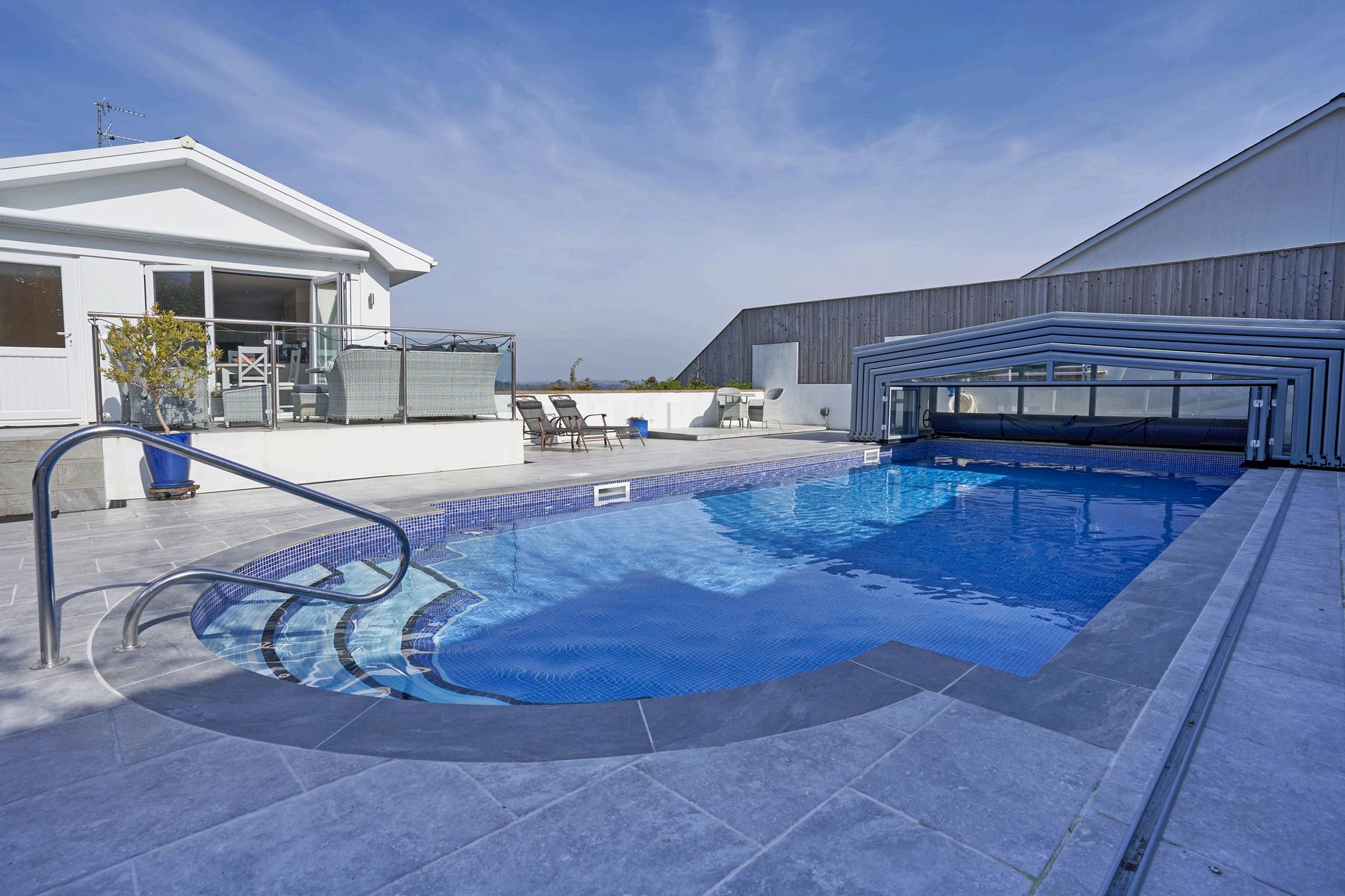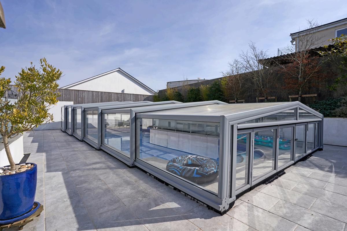 The outdoor, covered, heated swimming pool is a welcome treat, with a fully retractable sliding, lockable cover.
