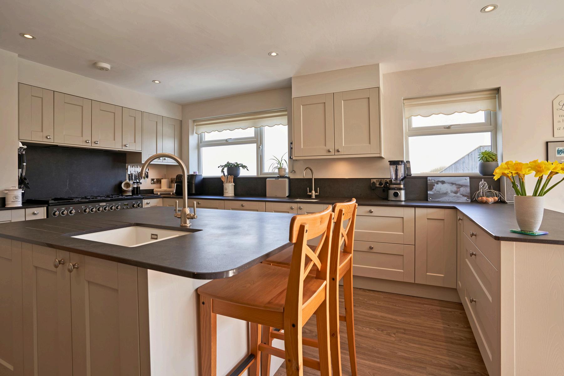 Adjacent to this light-filled space is the Dining and Breakfast Kitchen—a masterclass in artisanal design. Created by the local company Ratford Bridge, the cabinetry is paired with the industrial elegance of Dekton work surfaces. A generous central island serves as the social hub of the home, featuring integrated wireless charging and high-spec appliances, while bi-fold doors beckon you out to the rear gardens for al fresco mornings.