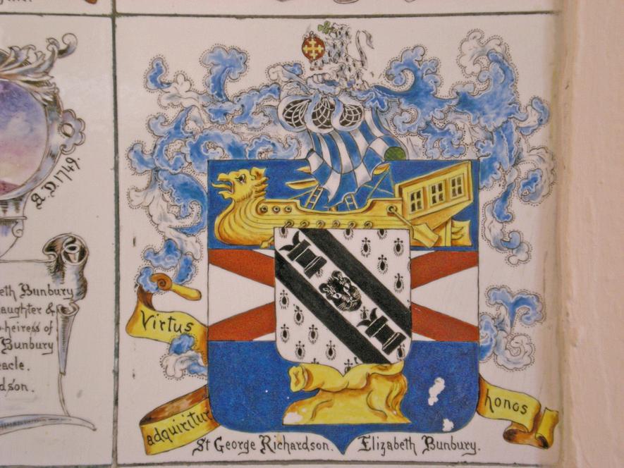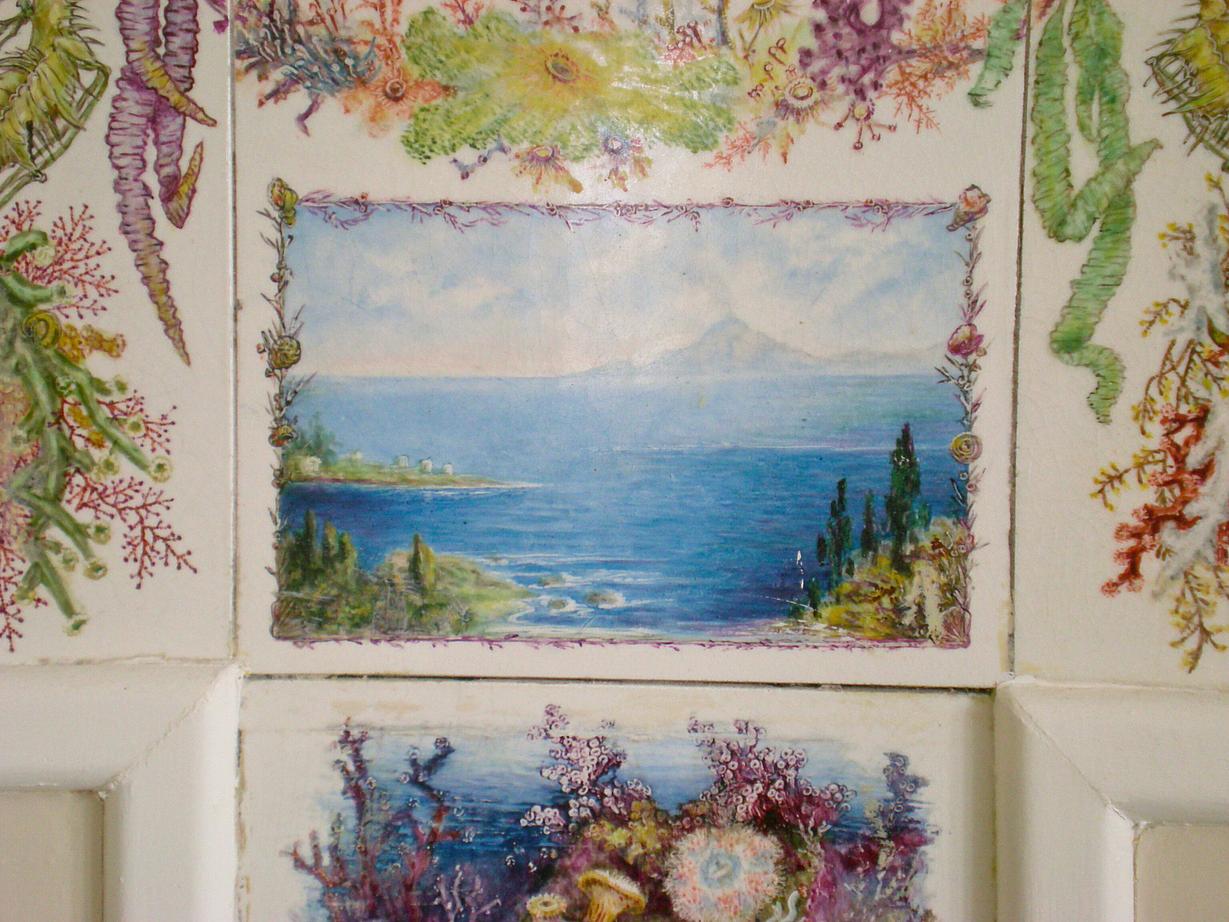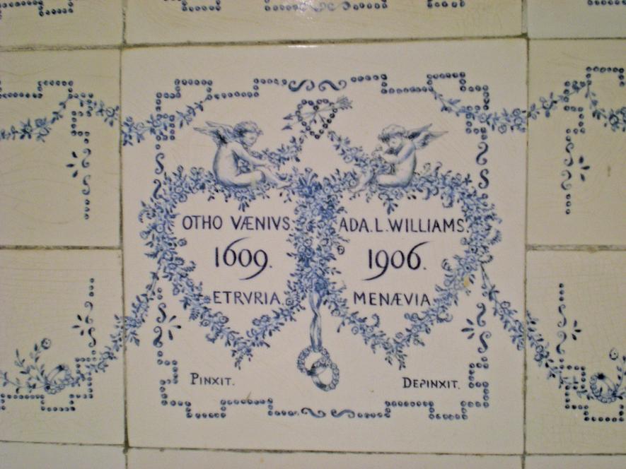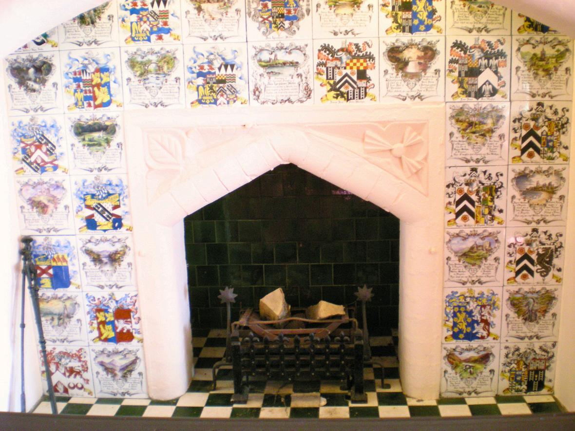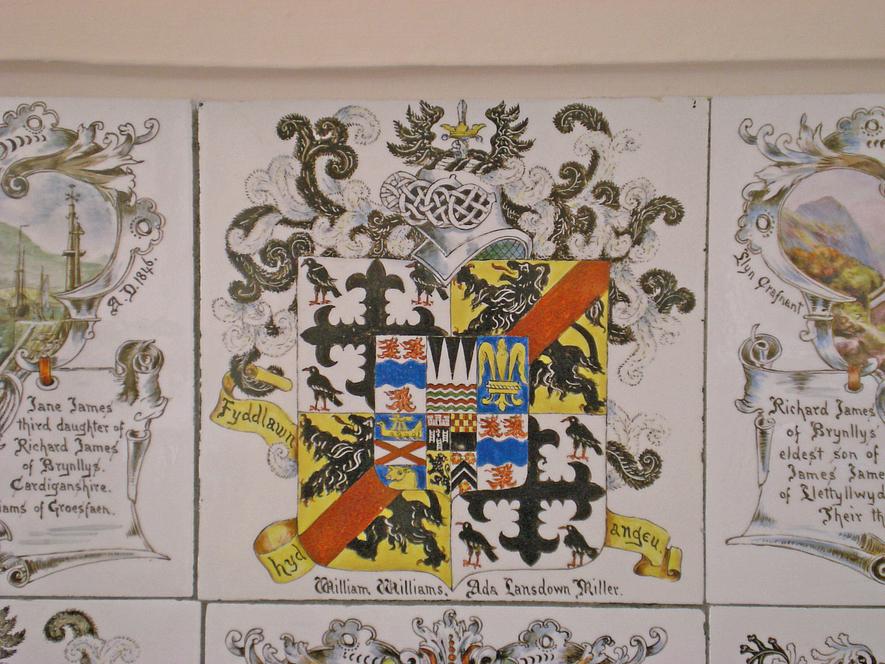 In 1899 the property was purchased by a window from Aberystwyth, Ada Lansdowne MillerWilliams and she and her Son Basil began a major project to research and depict her family’s genealogy on ceramic tiles, which was then displayed in several rooms of the house. She also decorated floral tiles for the top floor nursery, a frieze of blue and white ‘Wedgewood’ tiles for her studio, ‘Arcadian’ scenes for her bedroom and a fire surround in rococo style for the drawing room.Basil was also responsible for the porte-cochere at the front door, the Italianate terracing and the various Greek and Latin mottoes and symbols.