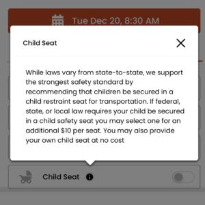 Set the toggle to the right to add the $10 “Child Seat” accommodations to your ride. Once clicked, the app will give you the option to select the seat style and to add any additional seats at $10 each.