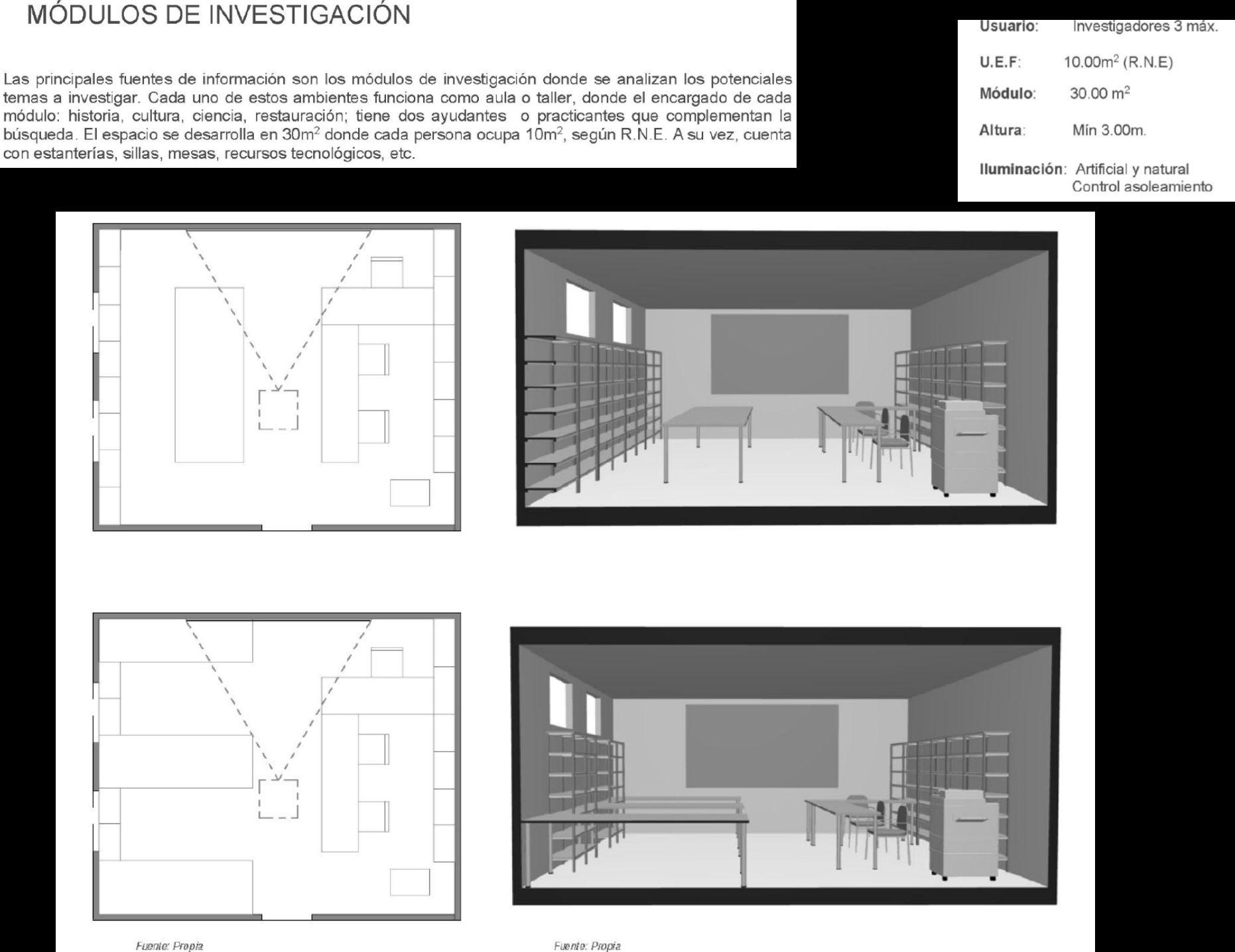 Las principales fuentes de información son los módulos de investigación donde se analizan los potenciales temas a investigar.Cadaunodeestosambientes funciona como aula o taller, donde el encargado de cada módulo: historia, cultura, ciencia, restauración; tiene dos ayudantes o practicantes que complementan la búsqueda. El espacio se desarrolla en 30 m2 donde cada persona ocupa 10m2, según R.N.E. A su vez, cuenta con estanterías, sillas, mesas,recursostecnológicos,etc.