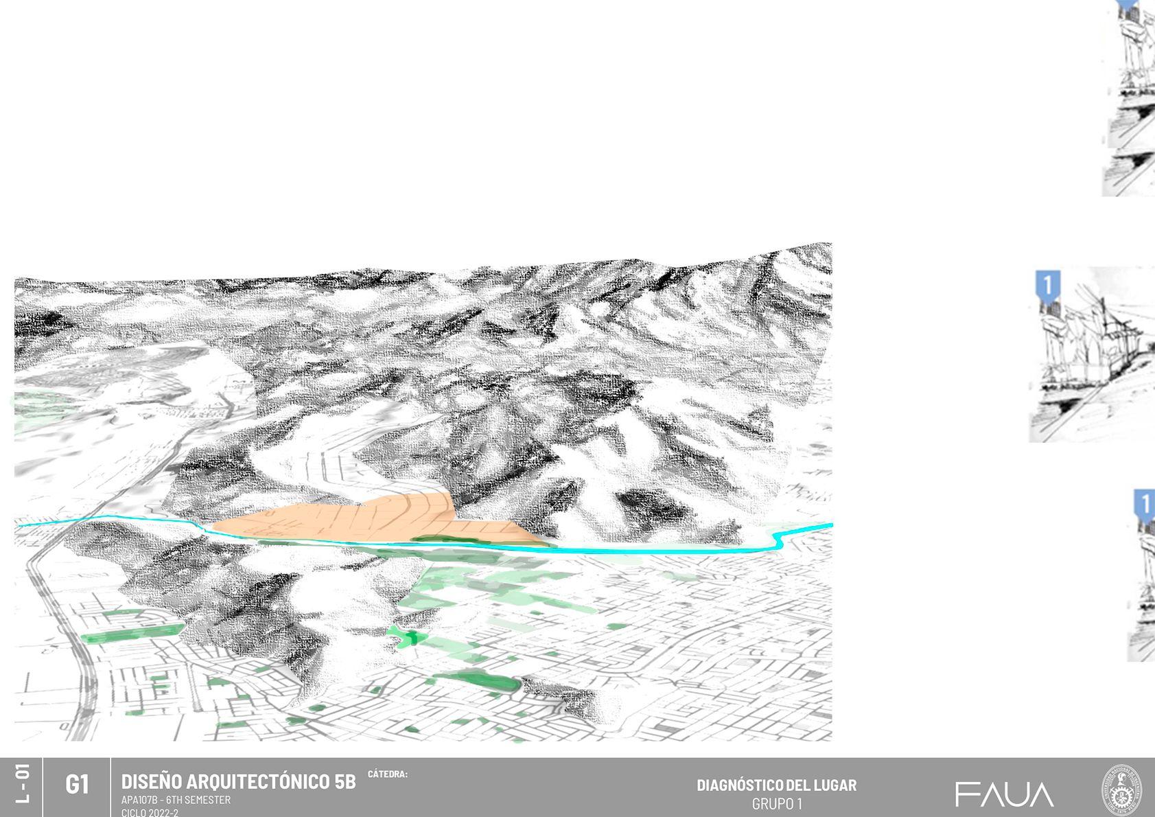 LARELACION DEL VECTOR CON EL ENTORNO ,el edificio permite emplazar todas sus disposiciones laterales,este abre un espacio a la plaza ,a su vez permite la permeabilidad para el transito a la huaca,y la rampa logra un mirador en la azotea..