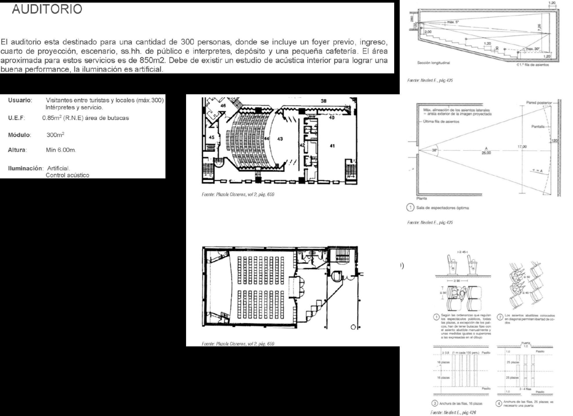 El auditorio está destinado para una cantidad de 300 personas, donde se incluye un foyer previo, ingreso, cuarto de proyección, escenario, ss.hh. de público e intérpretes, depósito y una pequeña cafetería. El área aproximada para estos servicios es de 850m2. Debe de existir un estudio de acústica interior para lograr una buena performance,lailuminaciónesartificial.